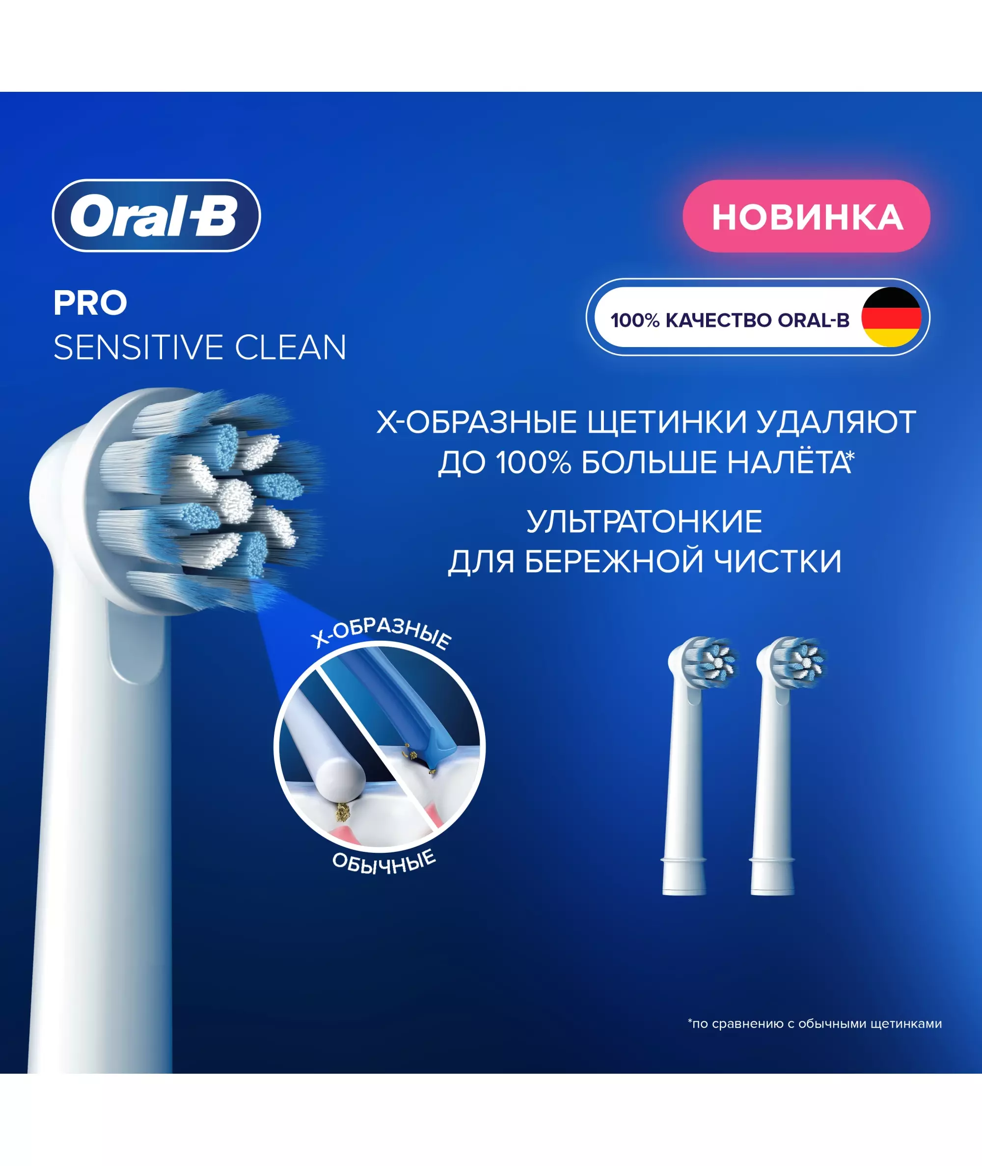 Сменные насадки Oral-B PRO Sensitive Clean для электрических зубных щёток Oral-B созданы совместно со стоматологами для эффективной ежедневной гигиены полости рта. Адаптивные Х-образные щетинки проникают во все участки полости рта, удаляя до 100% больше зубного налета и обеспечивая глубокое очищение