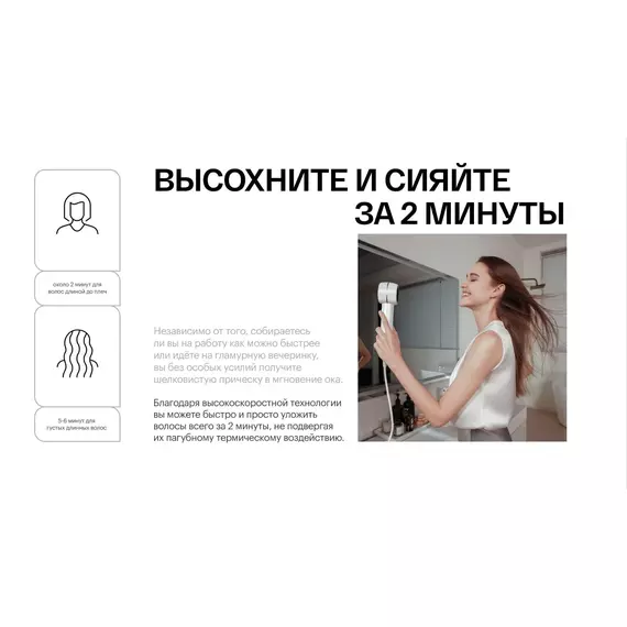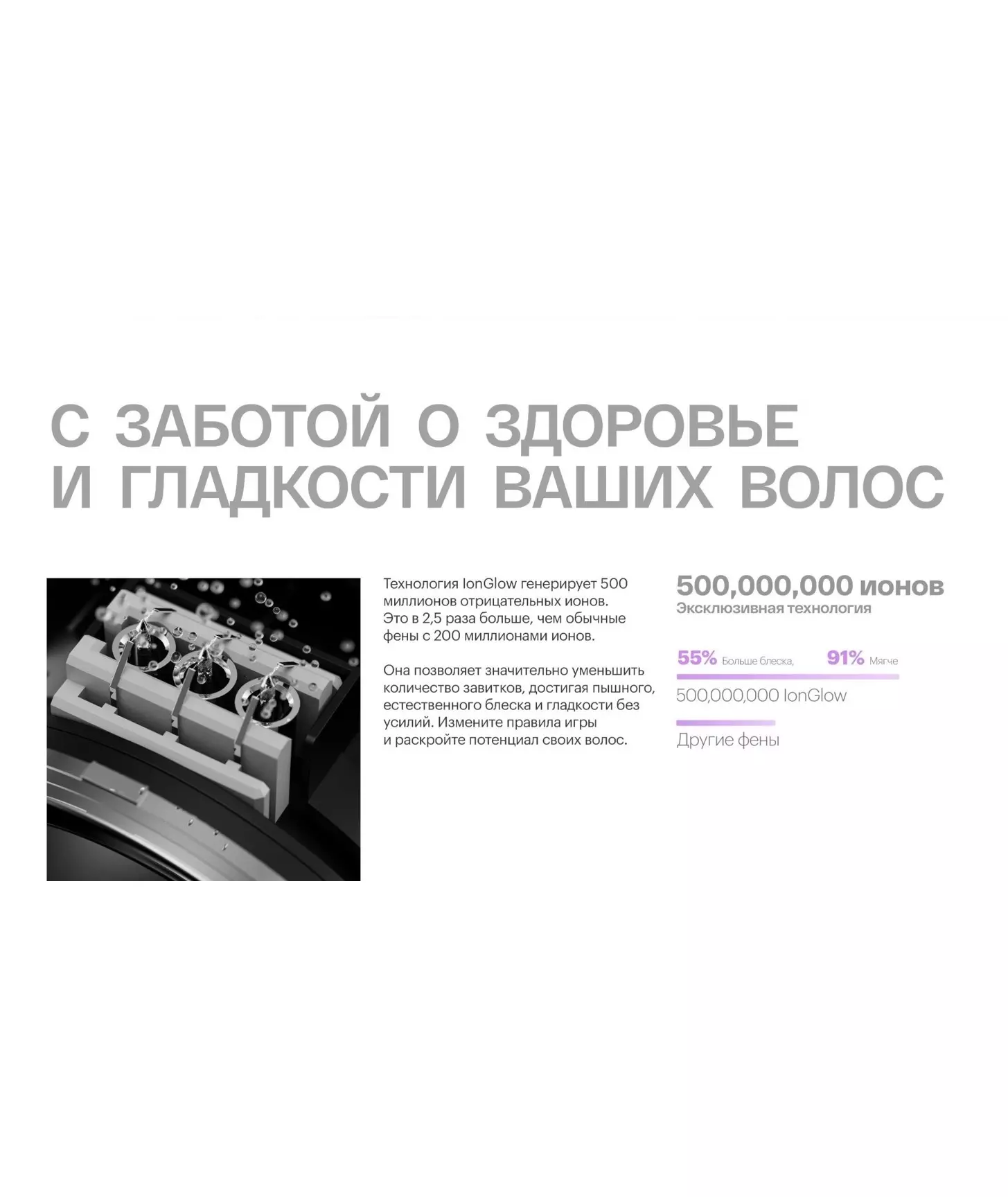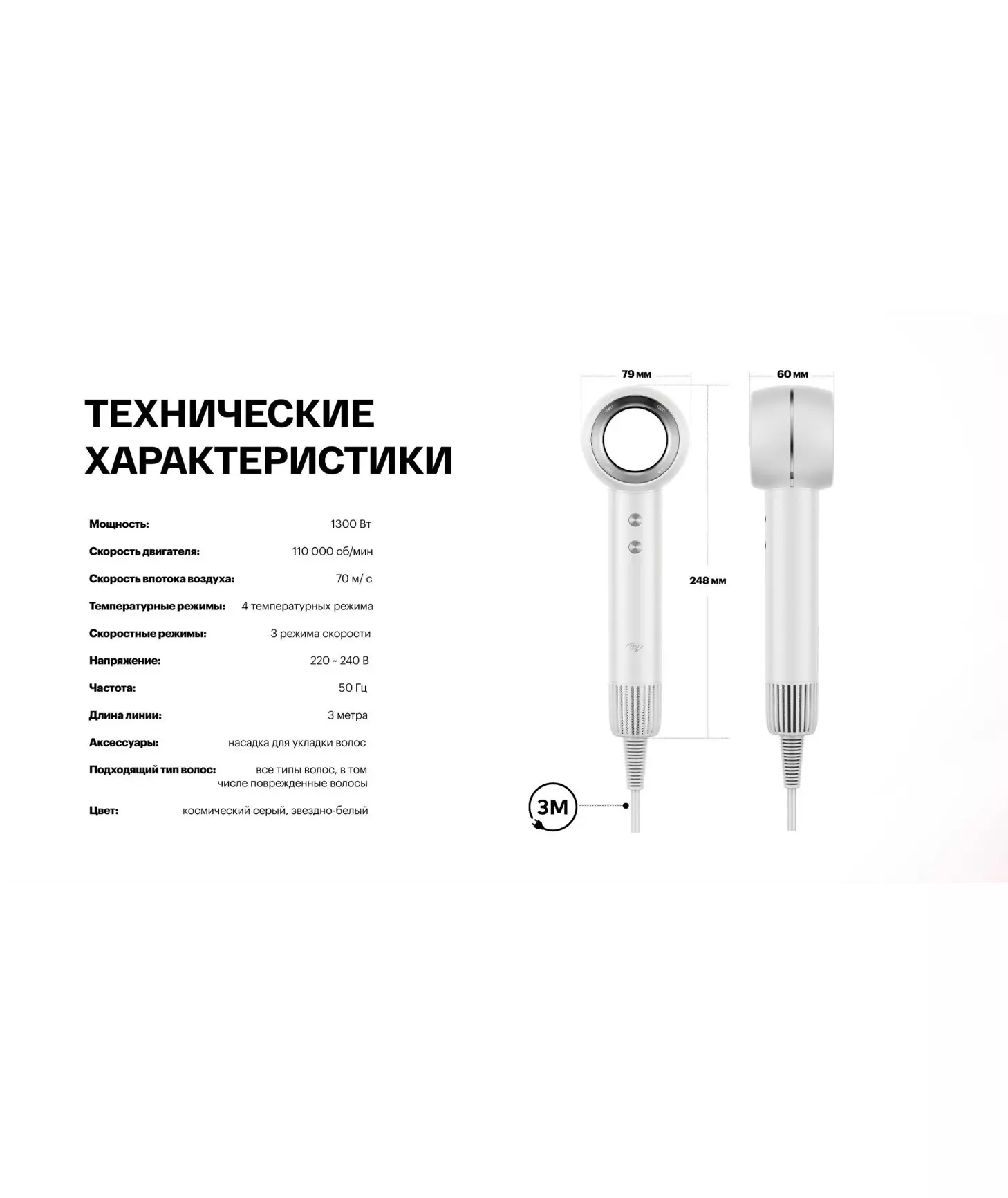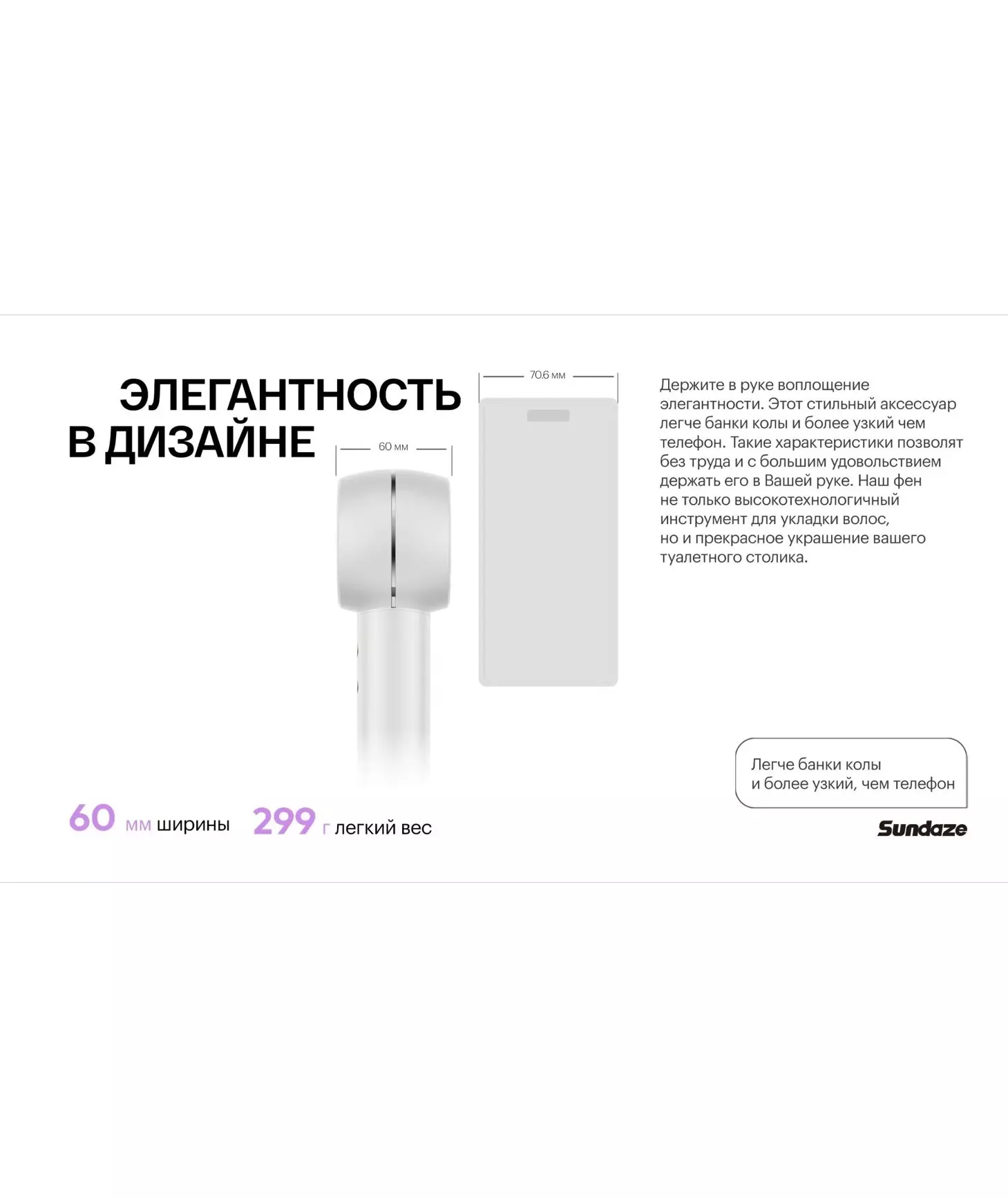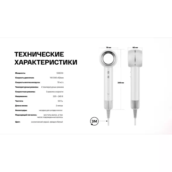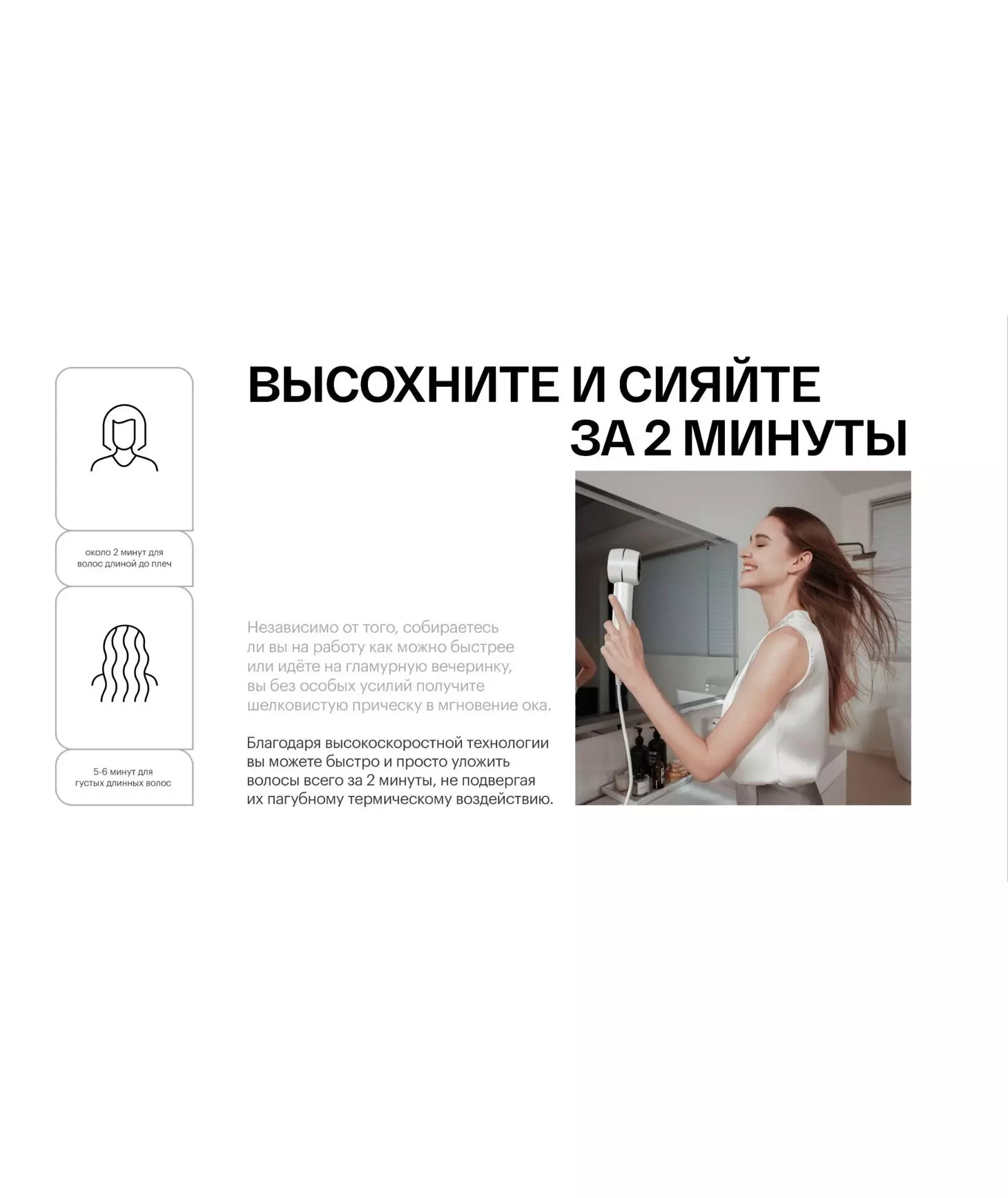 Высокоскоростной фен со скоростью потока 70 м/с, обеспечивает мгновенную сушку волос всего за 2 минуты, 4 температурных режима и 3 режима скорости помогут подстроиться под любой стиль укладки. Стильный и компактный. Бережно сохраняет волосы с 500 млн. негативных ионов и системой терморегулирования