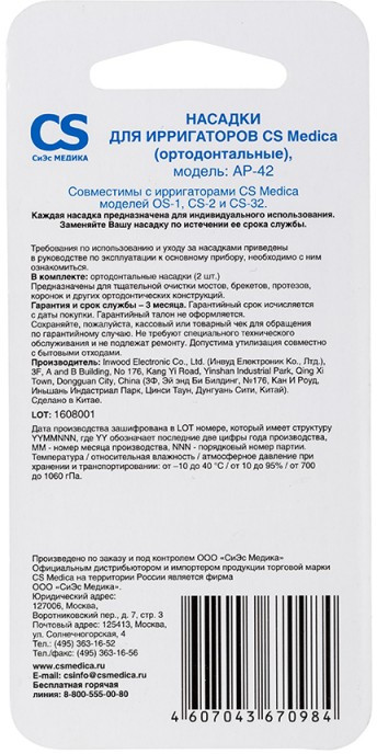 - Совместима с ирригаторами CS Medica моделей OS-1, CS-32, CS-2