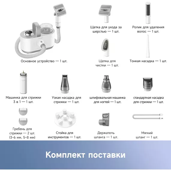 | Насадки | Пылесос, щетка для ухода за шерстью, щетка для чистки, гребень для стрижки - 2 шт (3-6 мм, 5-8 мм), держатель шланга, узкая насадка для стрижки, шлифовальная машинка для ногтей, стандартная насадка для стрижки, машинка для стрижки 3 в 1, ролик для удаления волос, мягкий шланг, тонкая насадка. |