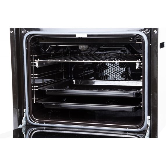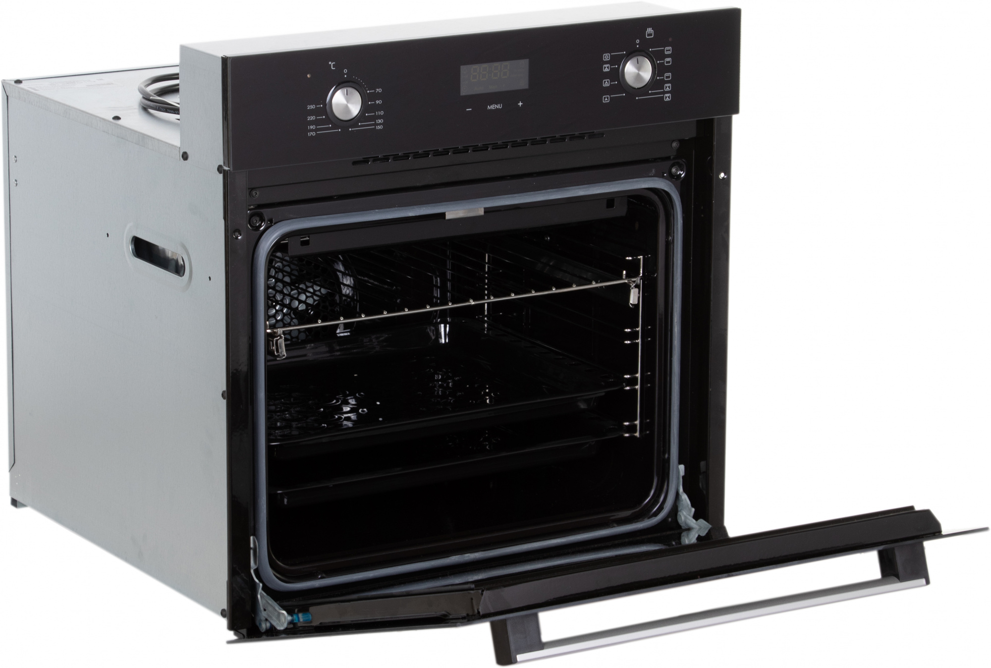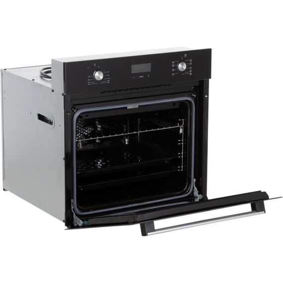 | Особенности | Встраиваемый электрический шкаф со стеклянным фасадом черного цвета, 9 режимов работы, тангенциальное охлаждение, электронный таймер, подсветка, конвектор, гриль, терморегулятор. |
