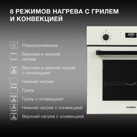 | Режимы духовки | подсветка, верхний и нижний нагрев, верхний и нижний нагрев + конвекция, нижний нагрев, гриль, гриль + конвекция, разморозка, нижний нагрев + конвекция, верхний нагрев + конвекция |