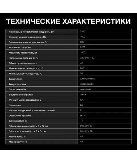 | Режимы духовки | Программа разморозки, Радиаторный гриль, Двойной гриль, Двойной гриль + вентилятор, Нижний нагрев/выпечка, Обычный + Вентилятор, Конвекция, Пицца, Быстрый предварительный нагрев, ЭКО, Ферментация, СВЧ, СВЧ + конвекция, СВЧ + двойной гриль+ вентилятор, СВЧ+пицца |