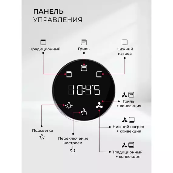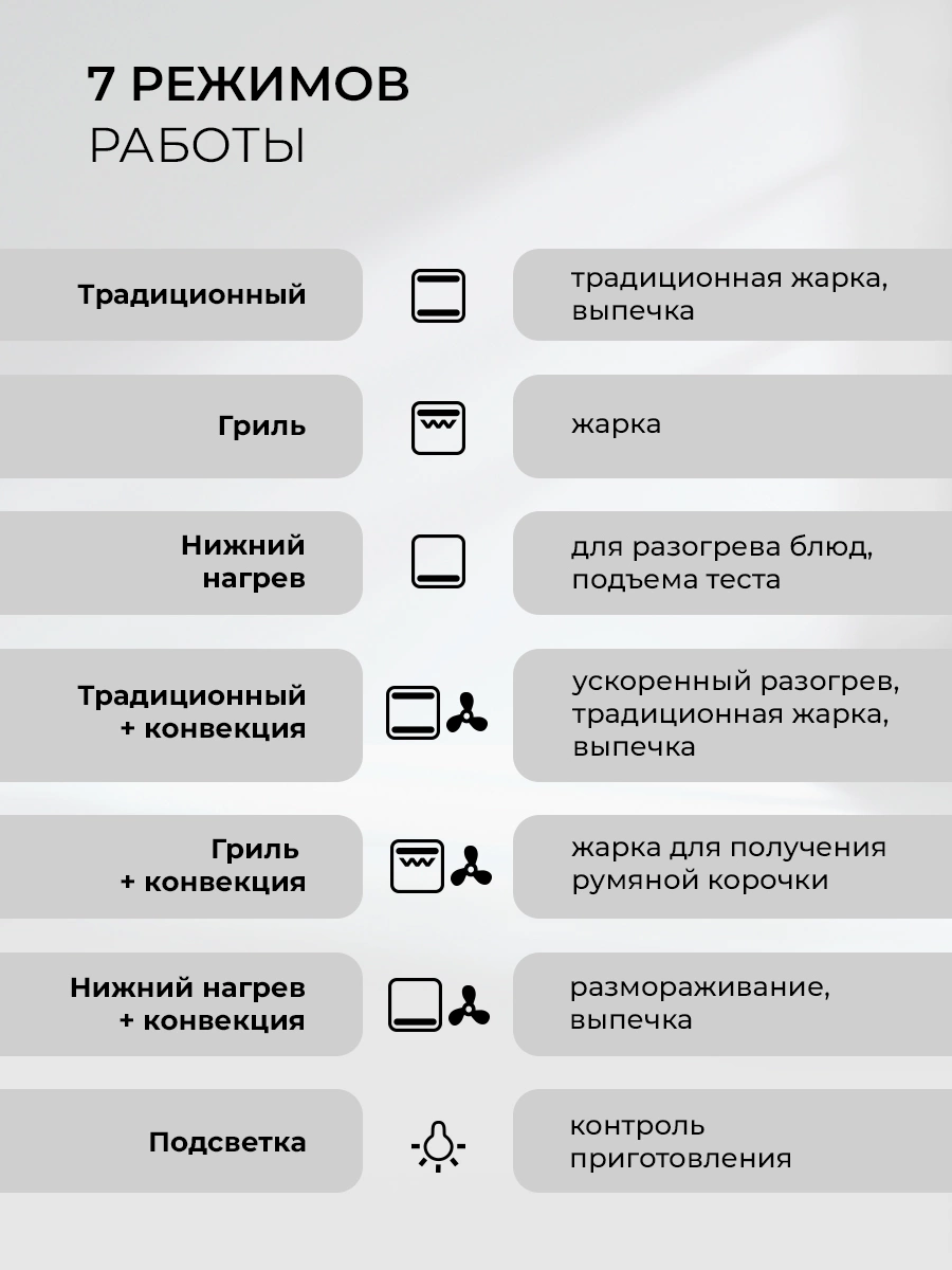 | Режимы духовки | Гриль, Гриль с конвекцией, Нижний нагрев, Нижний нагрев с конвекцией, Подсветка, Традиционный, Традиционныи? нагрев + конвекция |