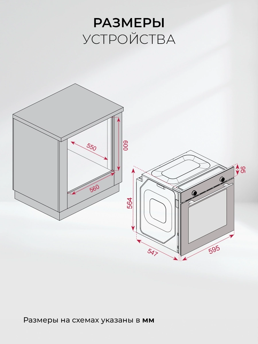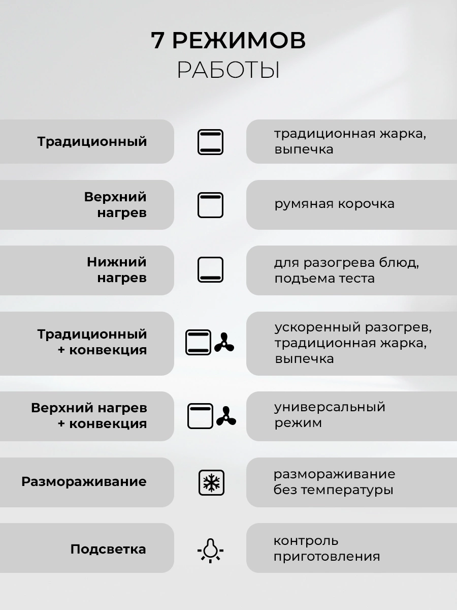 | Режимы духовки | Верхний нагрев, Верхний нагрев с конвекцией, Нижний нагрев, Подсветка, Размораживание, Традиционный, Традиционныи? нагрев + конвекция |