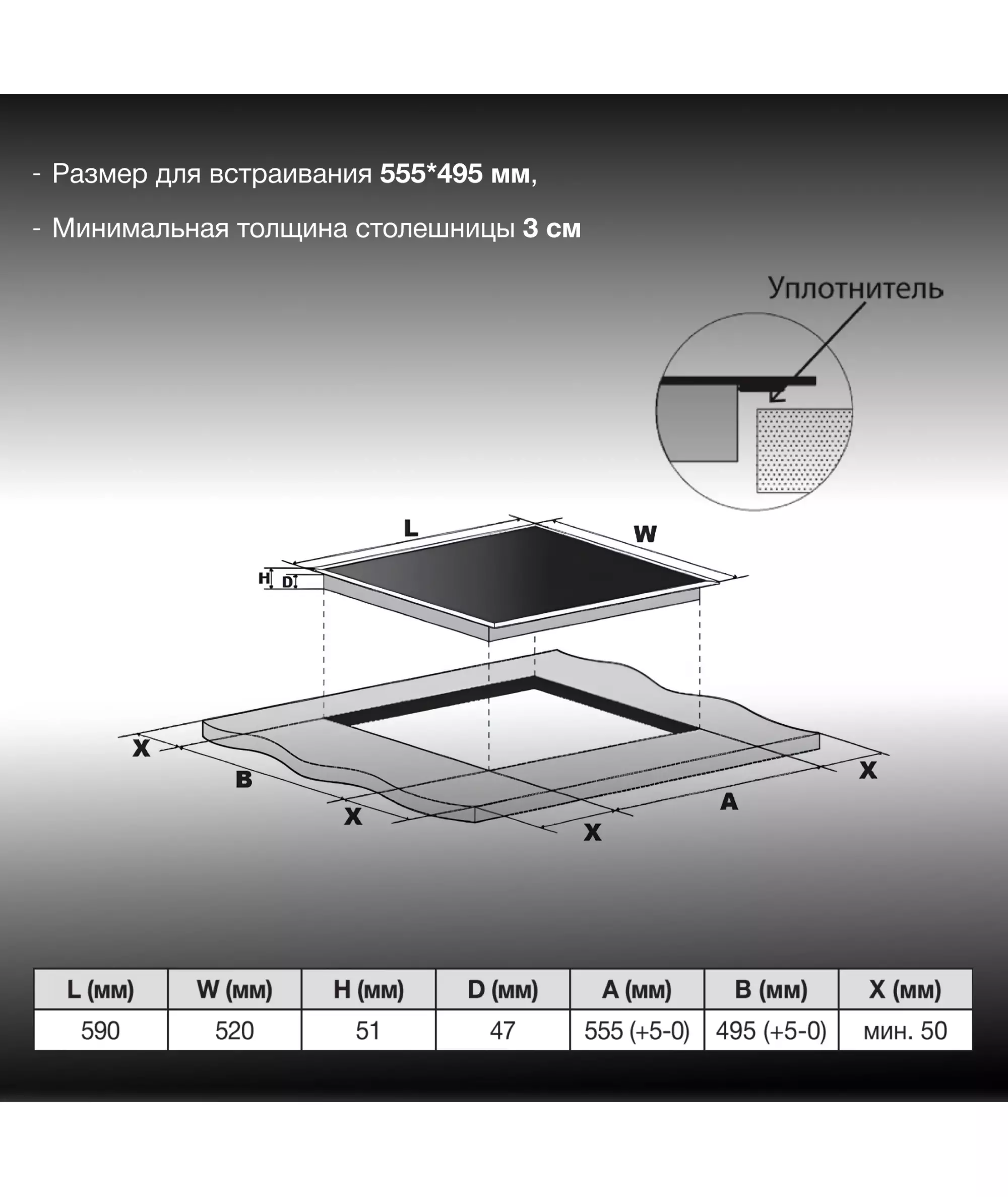 | Ширина ниши для встраивания | 495 мм |