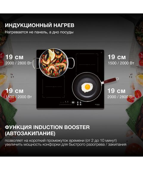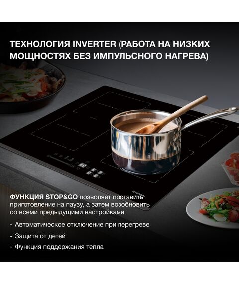 | Функциональные особенности | функция INDUCTION BOOSTER (автозакипание), INVERTER , функция FLEX ZONE (объединение зон нагрева), функция STOP&GO, функция KEEP WARM |