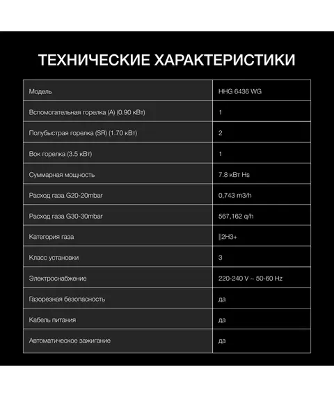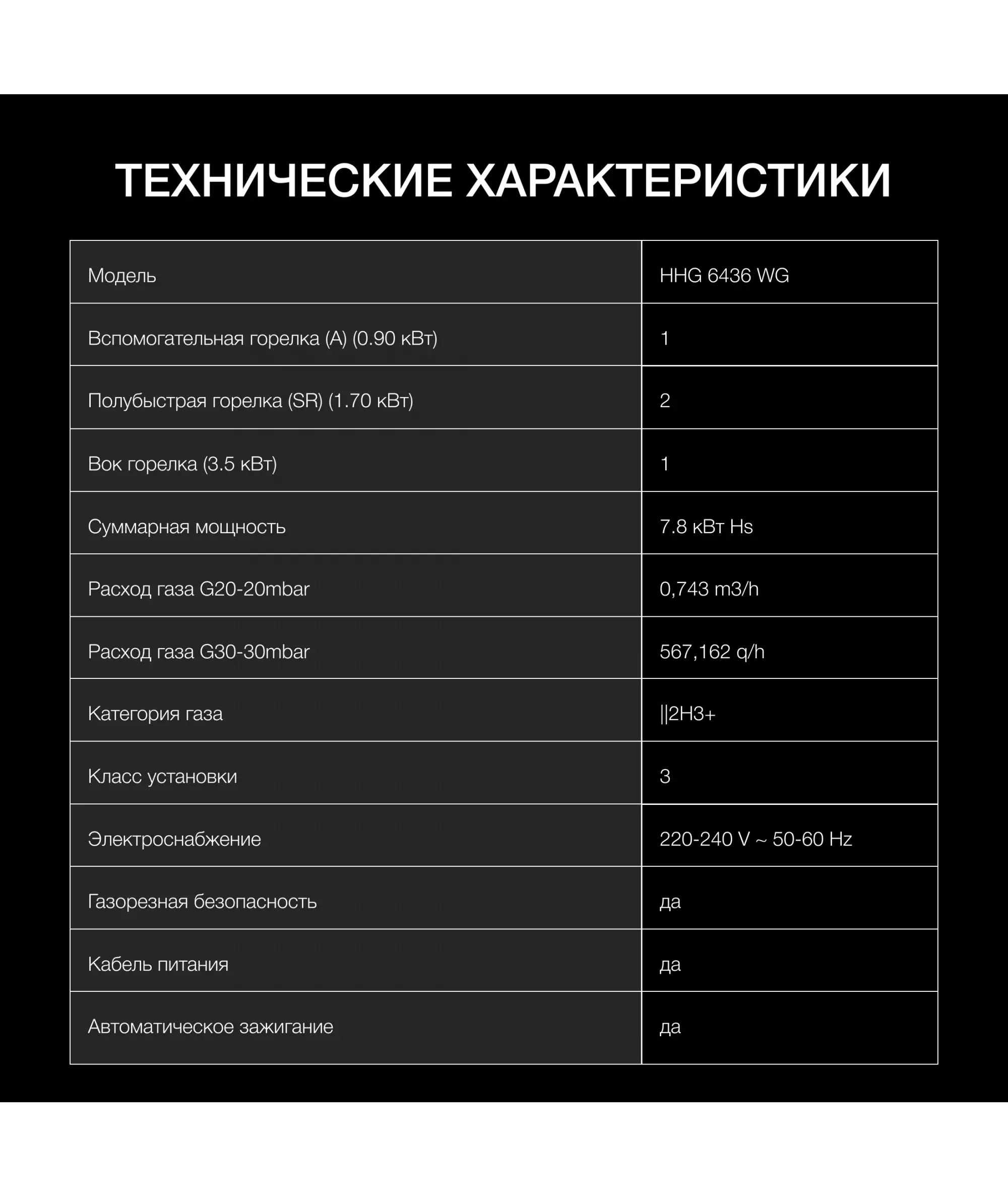 | Суммарная мощность газовых конфорок | 8 Вт |