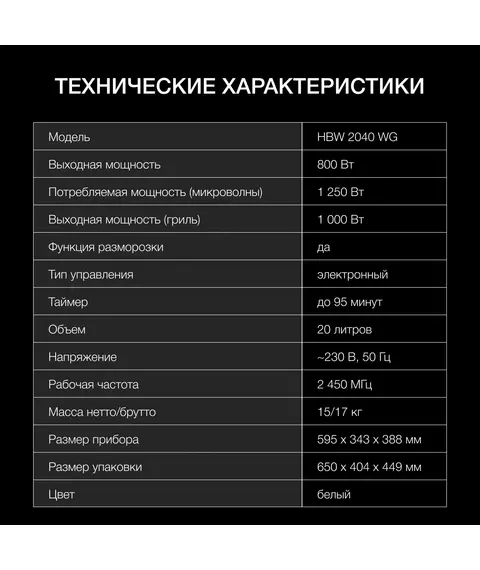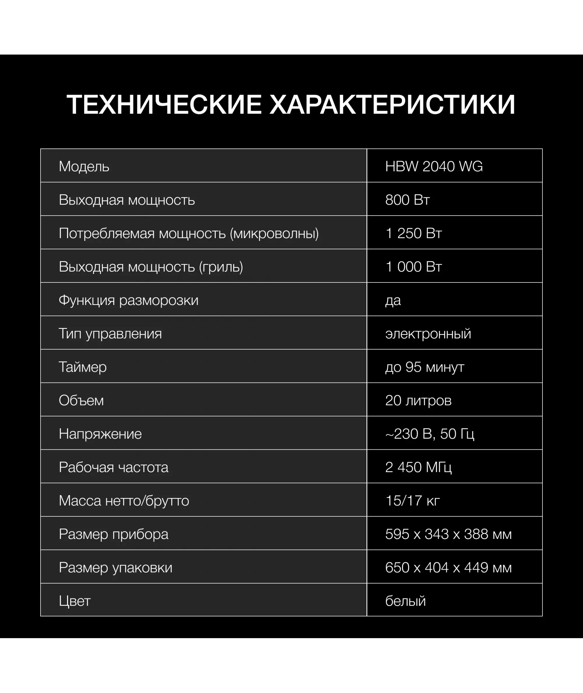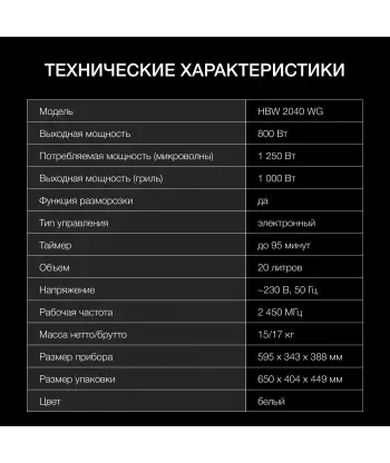 | Режимы | автоматическая разморозка, автоматический разогрев, гриль |