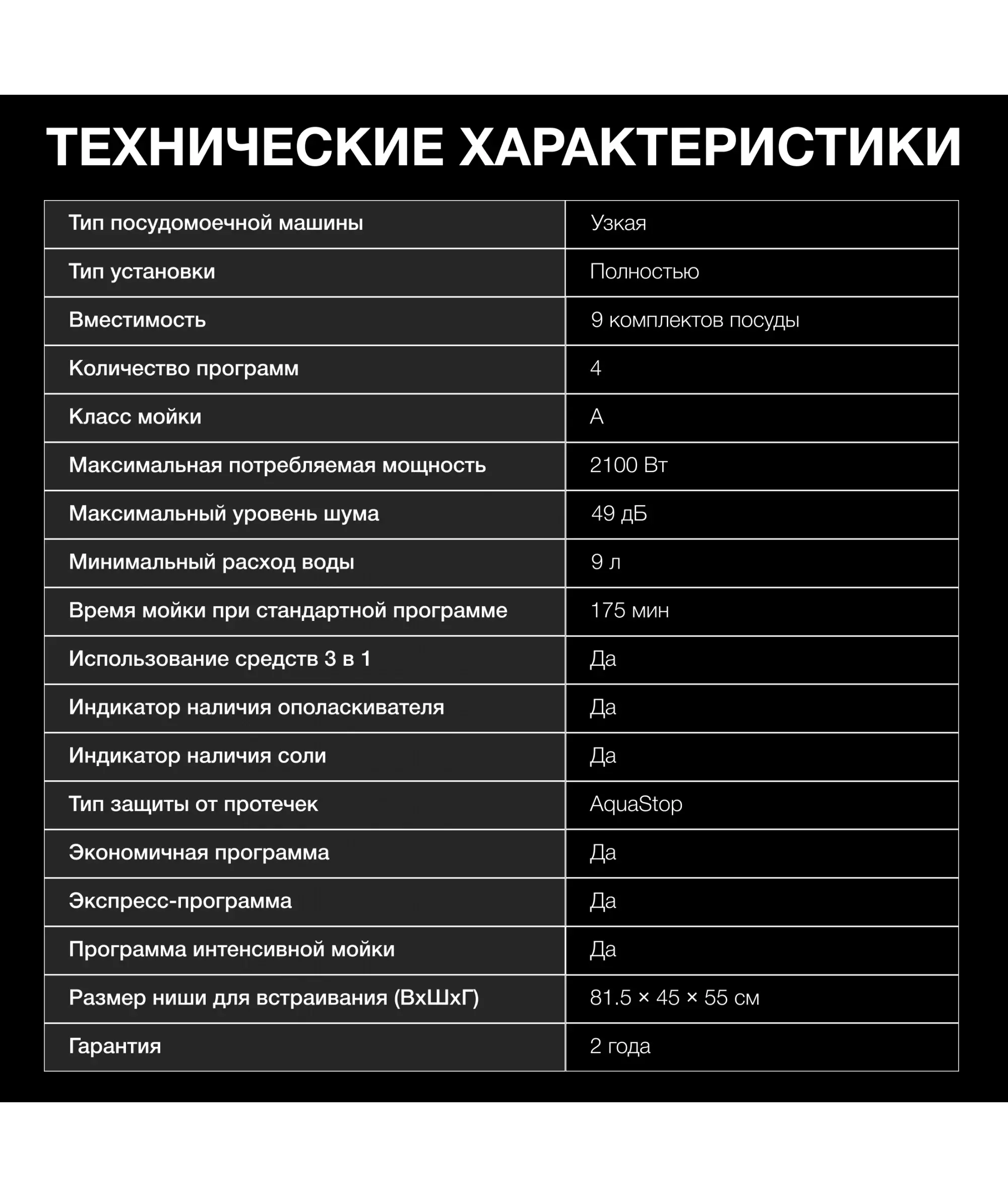| Режимы и программы | интенсивная мойка, стандартная программа, экономичная мойка, экспресс-программа |