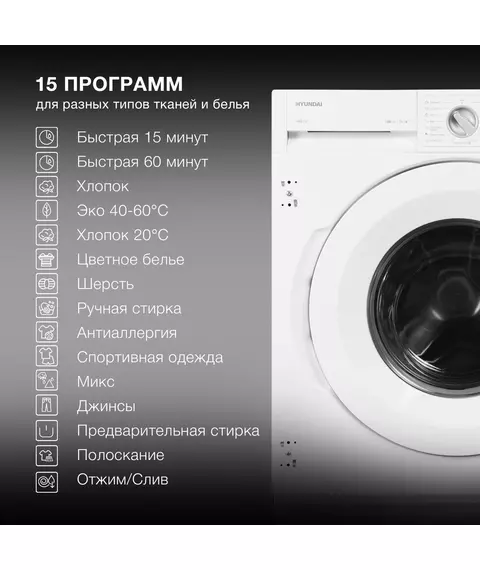 Хлопок, Эко 40-60, Предварительная стирка, Хлопок 20°C, Цветное белье, Шерсть, Полоскание, Антиаллергия, Отжим/Слив, Ручная стирка, Спортивная одежда, Микс, Джинсы, Быстрая 60’, Быстрая 15’