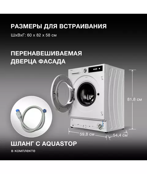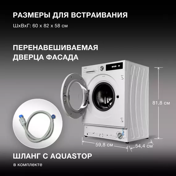 | Дополнительно | Петли для крепления фасада, заливной шланг с AquaStop, заглушки для отверстий под транспортировочные болты, разделитель отсека, монтажные элементы |