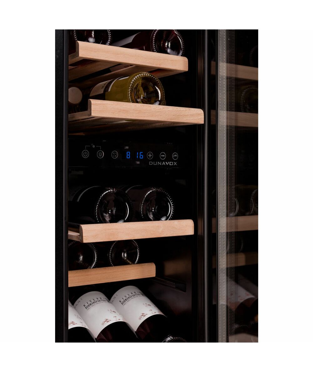 - Компрессорный винный шкаф Dunavox DAUF-17.58DB обладает средней вместимостью и способен разместить в себе до 17 бутылок. Располагаются они на выдвижных полках из массива бука.