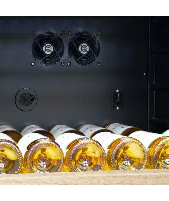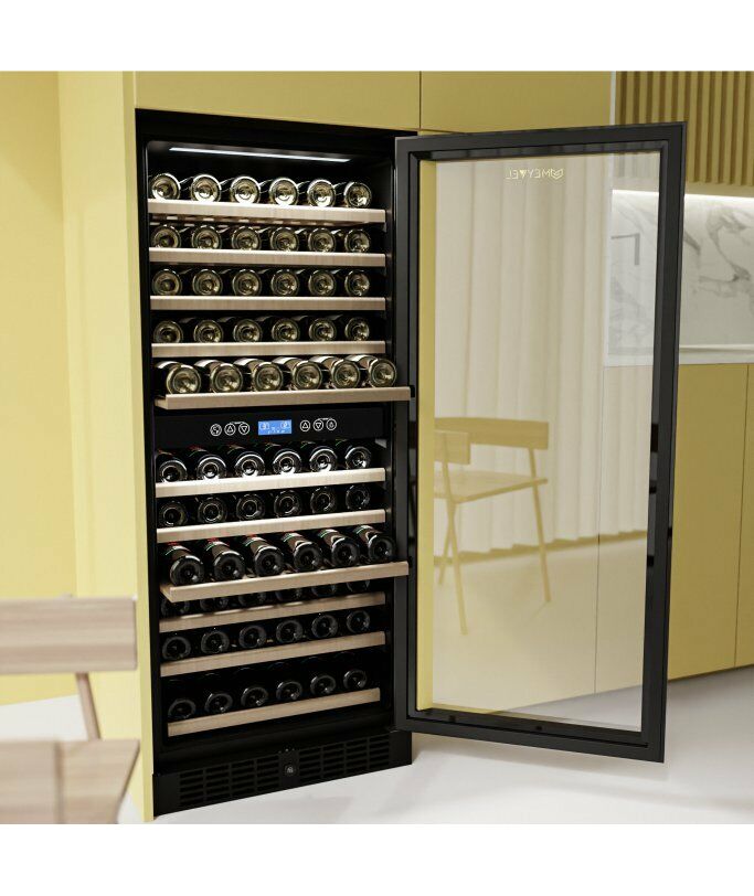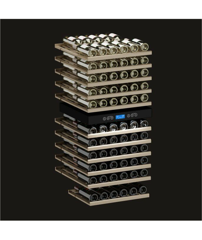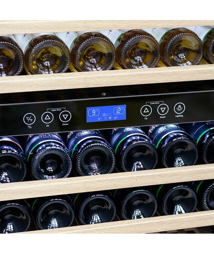 - Компрессорный винный шкаф Meyvel MV116-KBT2 обладает большой вместимостью и способен разместить до 126 бутылок. Располагаются они на полках из массива бука. Внутреннее пространство шкафа разделено на 2 температурные зоны с возможностью настраивать каждую из них: диапазон нижней зоны от +10°C до +18°C, а верхней - от + 5°C до +10°C. Холодильник поддерживает влажность в диапазоне 60-80%, как в настоящем винном погребе.