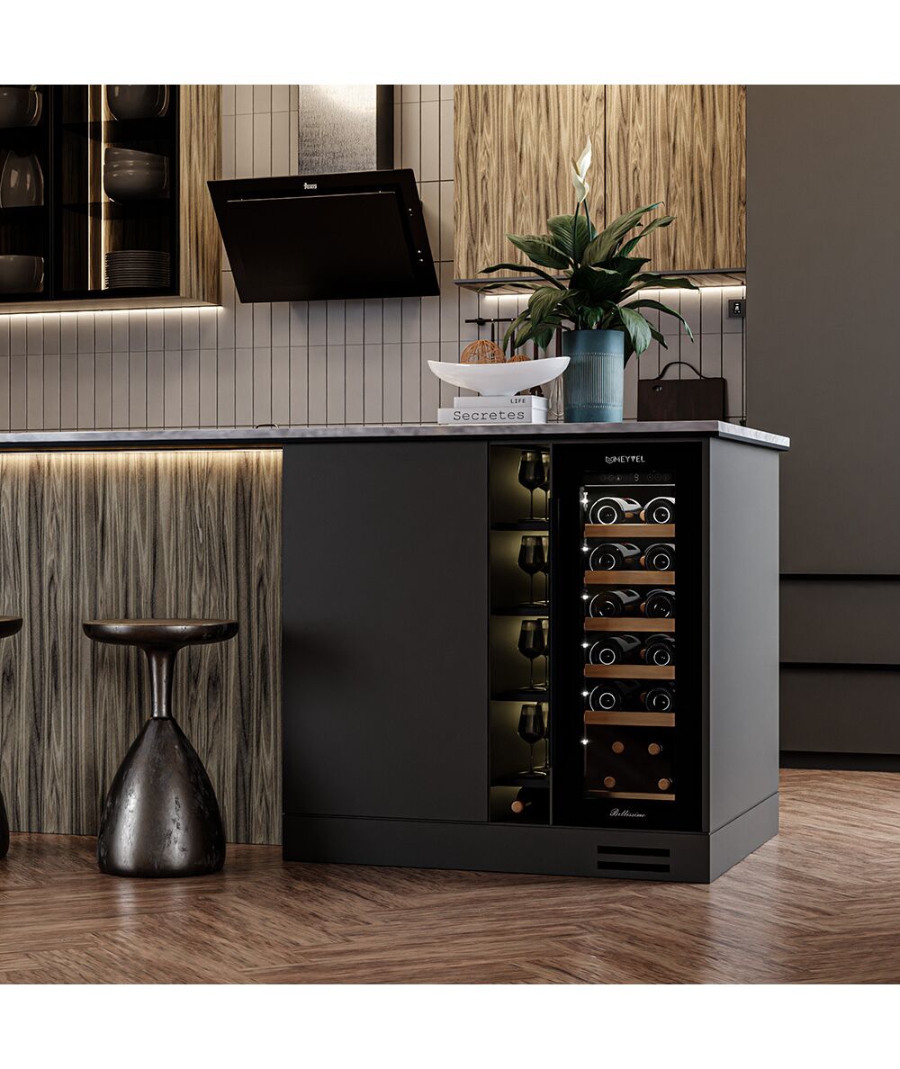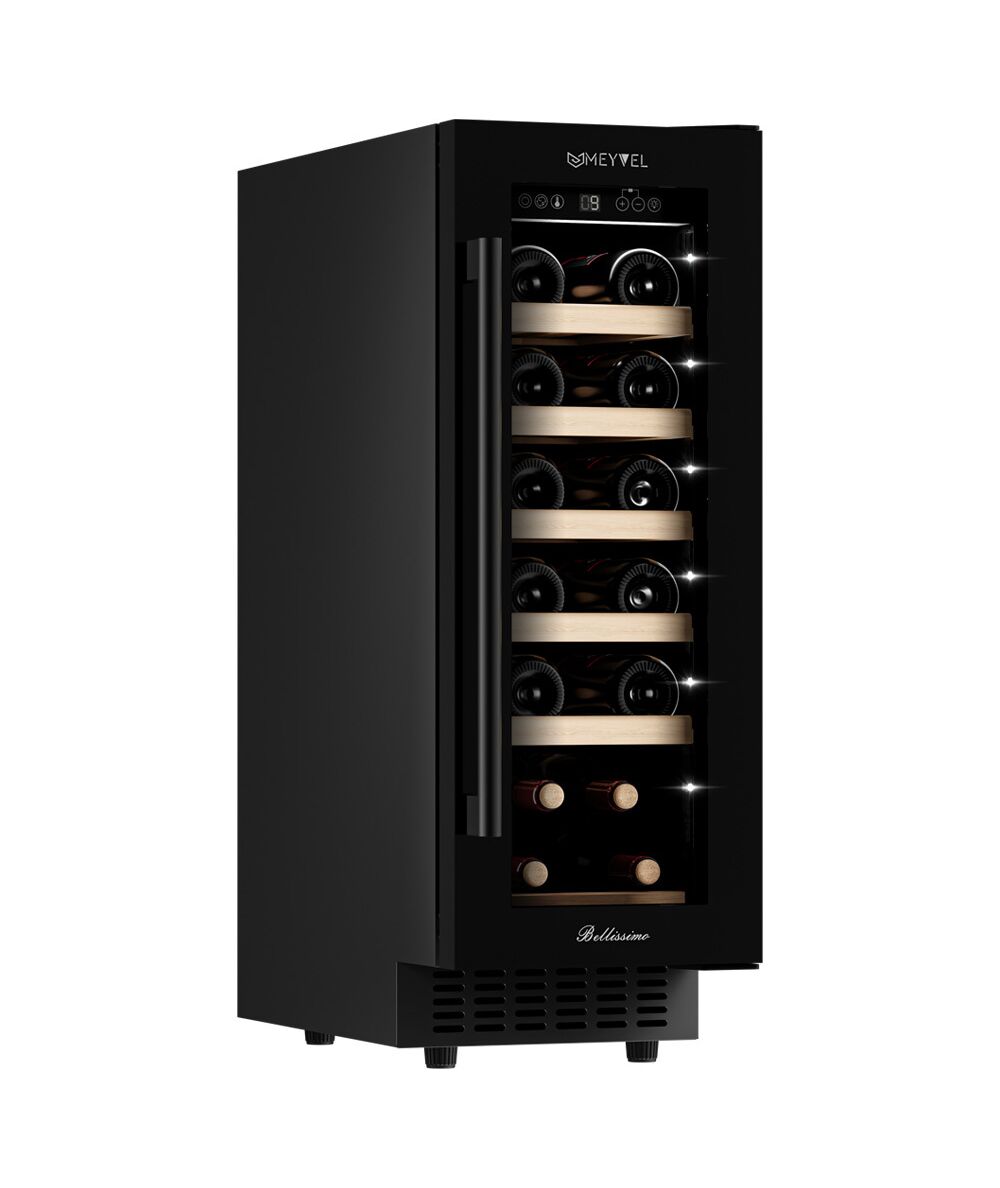 - Компрессорный винный шкаф Meyvel MV19-KBT1 обладает оптимальной вместимостью и даёт возможность разместить до 19 бутылок стандартного типа Бордо (0,75 л). Располагаются они на выдвижных полках из дерева. Внутреннее пространство шкафа поддерживает комфортную для вина температуру от +5°C до +20°C. Так же, эта модель поддерживает влажность в диапазоне 60-80%, как в настоящем винном погребе.