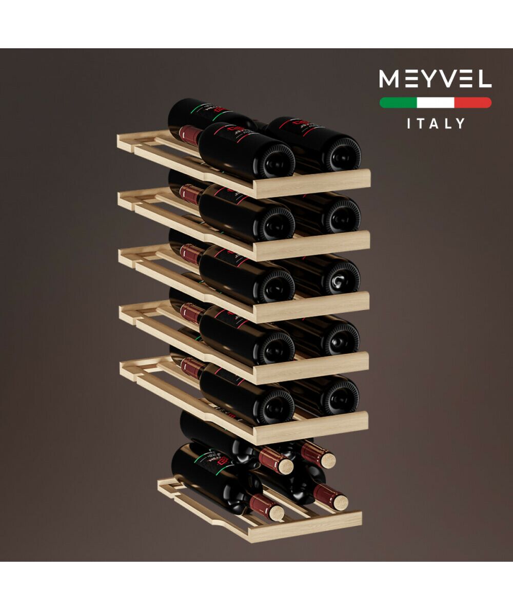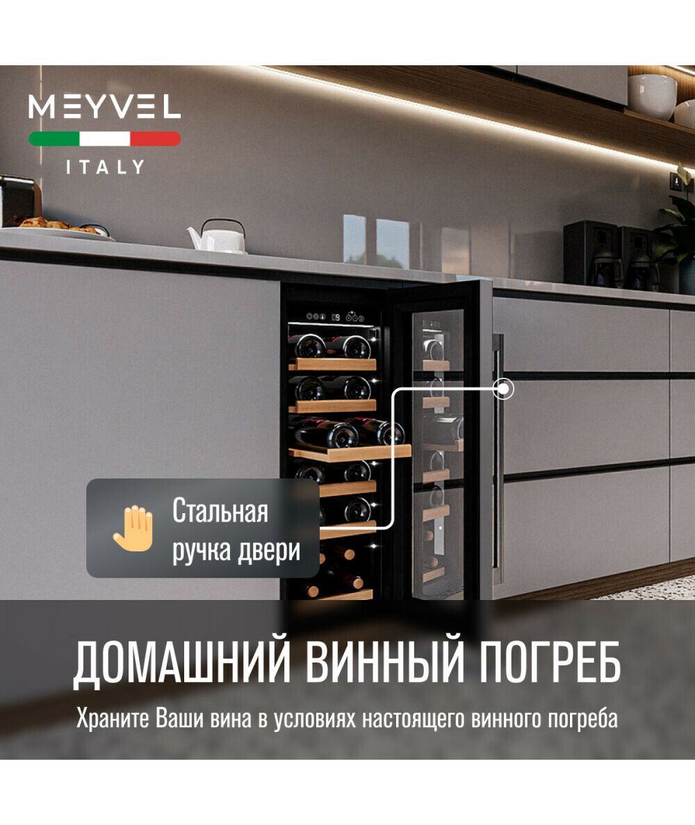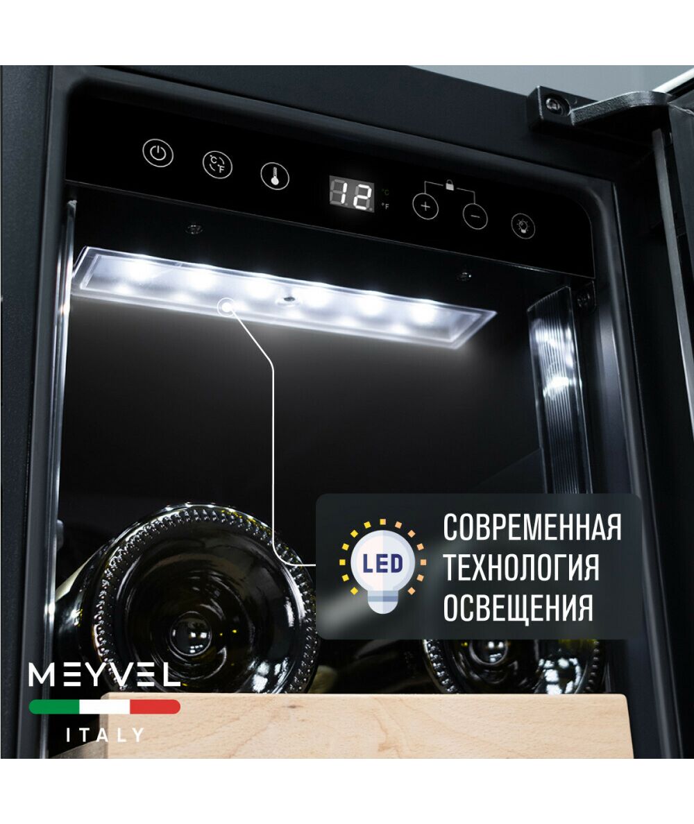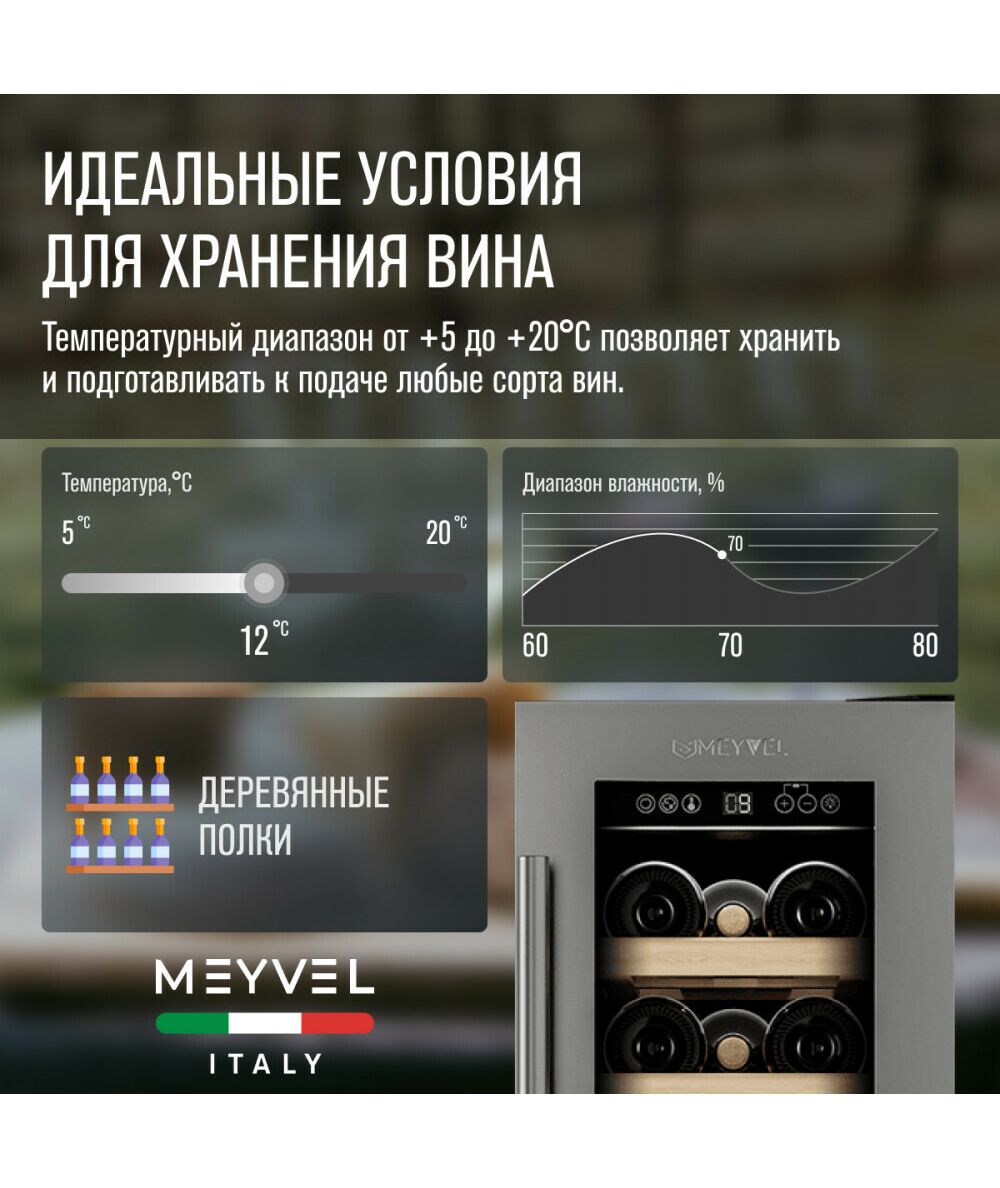 - Компрессорный винный шкаф Meyvel MV19-KST1 обладает оптимальной вместимостью и даёт возможность разместить до 19 бутылок стандартного типа Бордо (0,75 л). Располагаются они на выдвижных полках из дерева. Внутреннее пространство шкафа поддерживает комфортную для вина температуру от +5°C до +20°C. Так же, эта модель поддерживает влажность в диапазоне 60-80%, как в настоящем винном погребе.