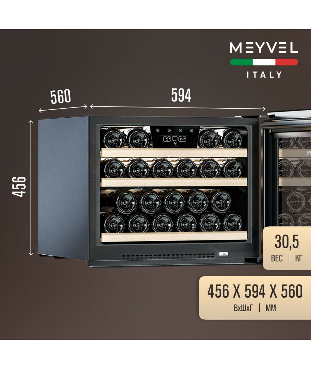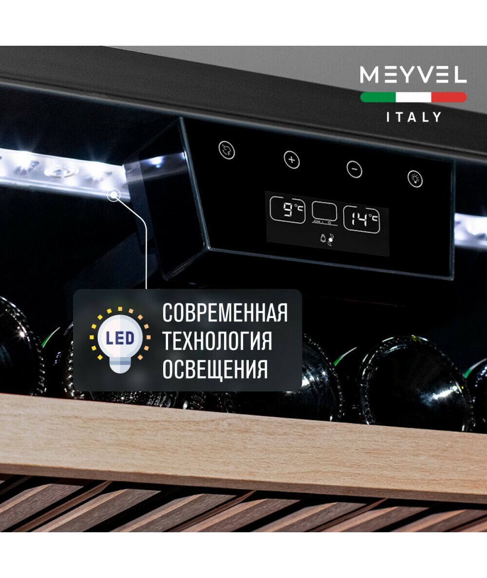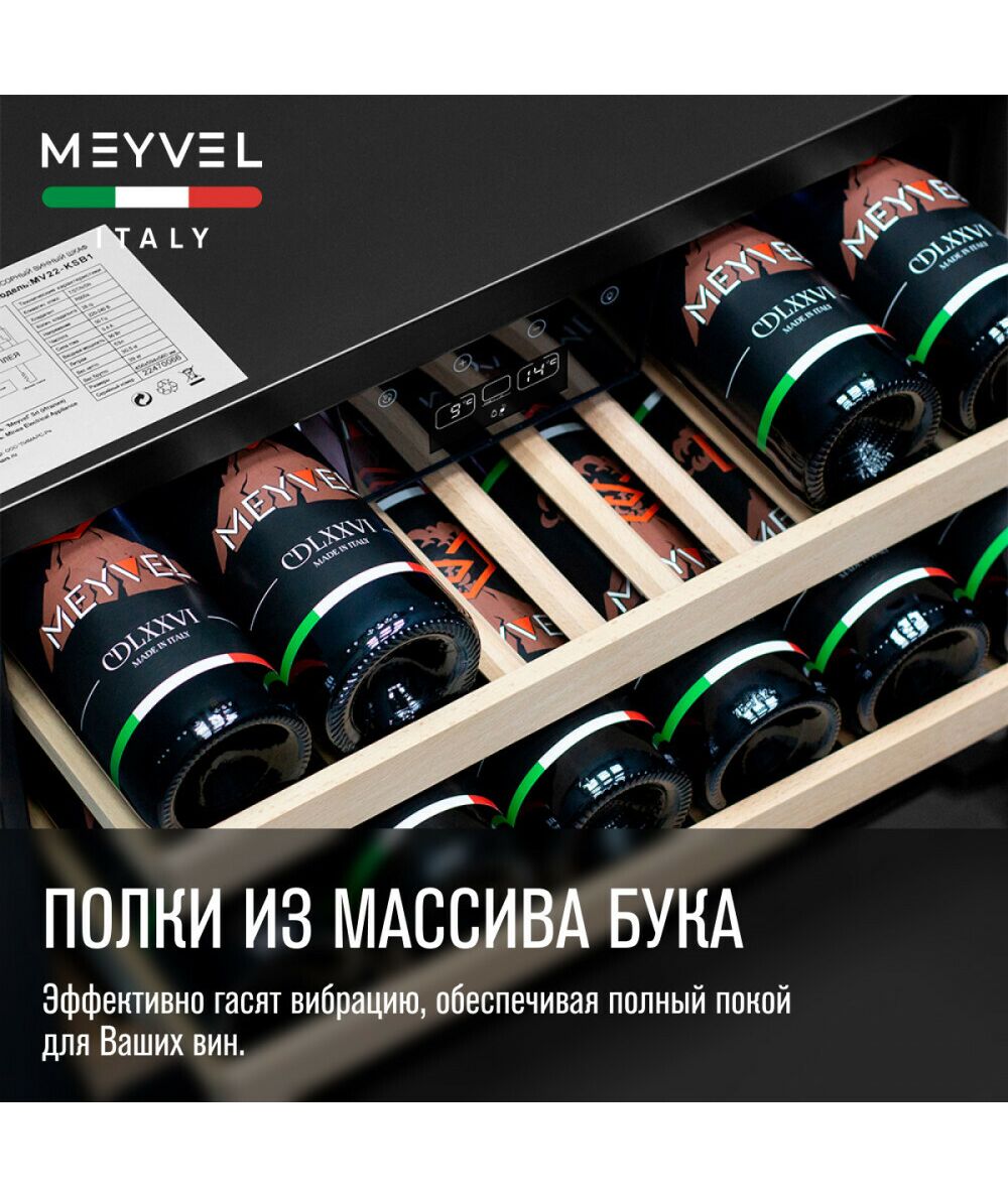 - Модель MV22-KBB1 имеет привлекательный внешний вид, сочетающий в себе неподвластное времени очарование натуральных материалов с высокотехнологичными системами сохранения пищевых продуктов. Винный холодильник Meyvel MV22-KBB1 оснащен дверью с защитой от ультрафиолетовых лучей и отлично подойдет для хранения и созревания различных сортов вин. Динамическая система охлаждения обеспечивает оптимальную температуру для вина и сохраняет необходимую влажность внутри камеры.