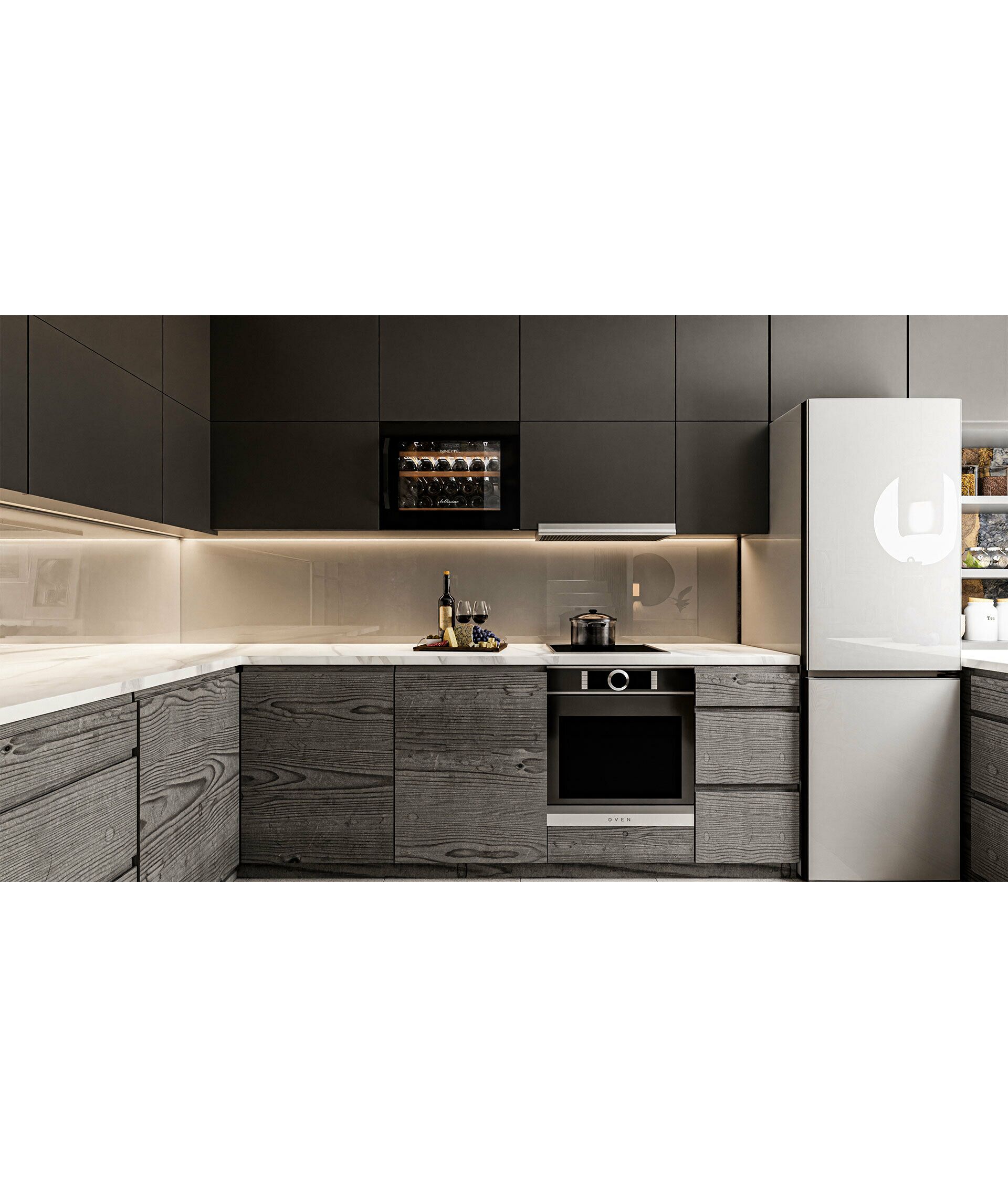- необходимо установить винный шкаф по уровню и отрегулировать зазоры между дверью и мебельными фасадами, чтобы не повредить их.