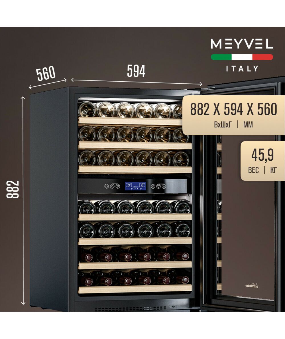 - Meyvel MV42-KBB2 поддерживает оптимальную температуру и влажность воздуха, а также изолирует вина от воздействия солнечных лучей. MV42-KBB2 отлично подходит для созревания и хранения вина, так как имеет две температурные зоны: диапазон верхней от +5°C до +10°C, а нижней - от +10°C до +18°C.