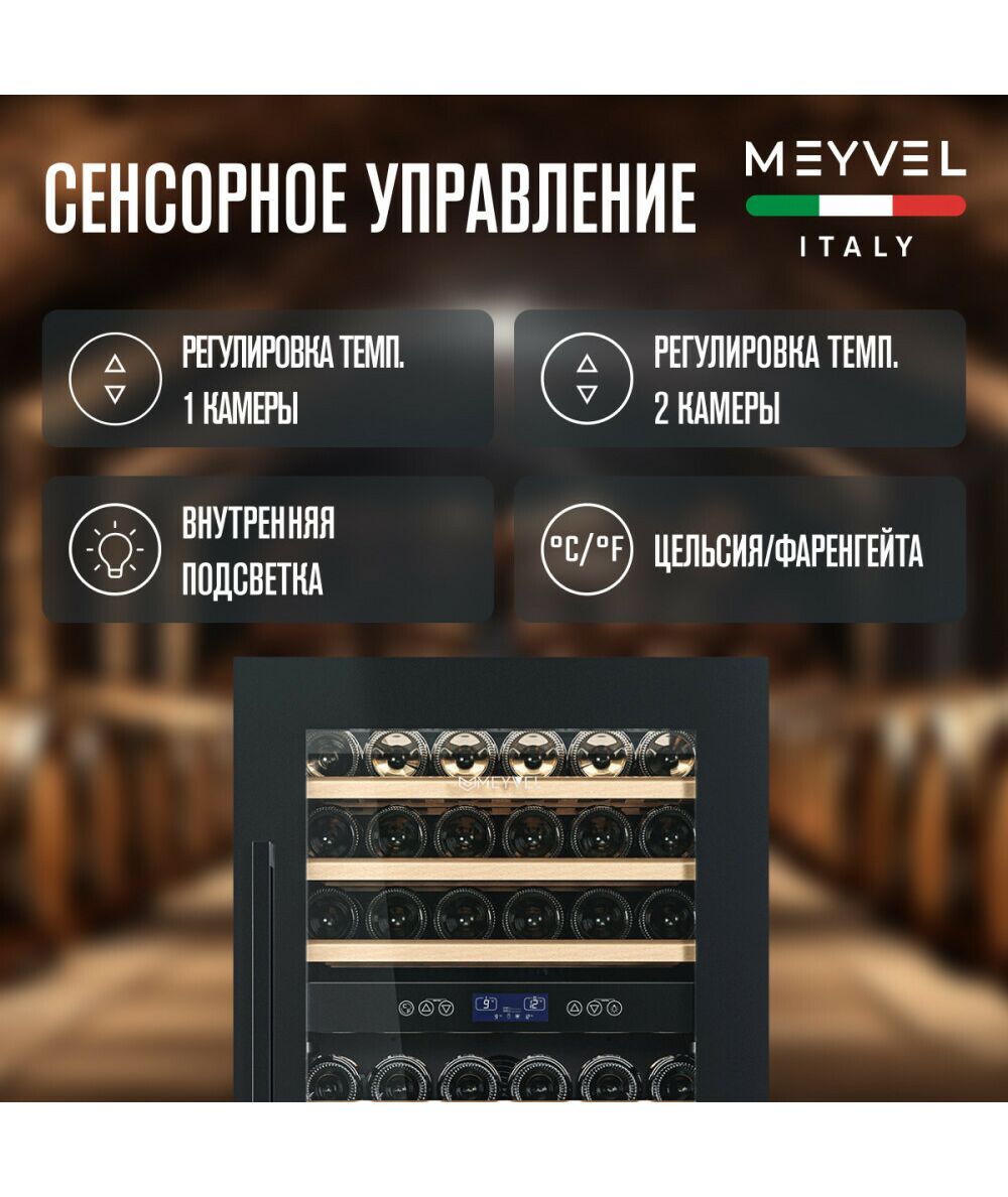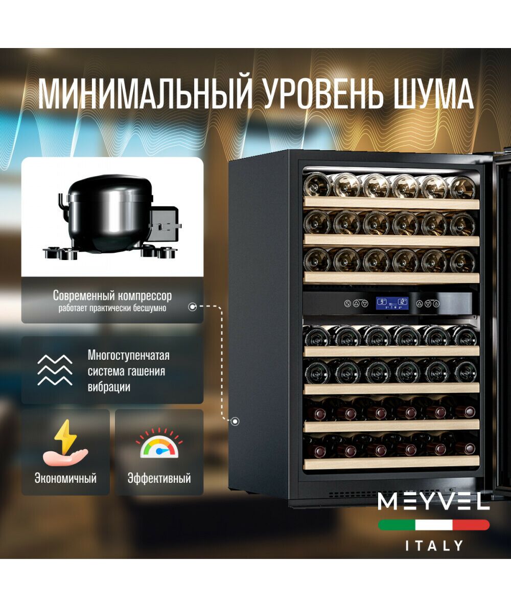 - Модель MV42-KBB2 имеет привлекательный внешний вид, сочетающий в себе неподвластное времени очарование натуральных материалов с высокотехнологичными системами хранения. Винный холодильник Meyvel MV42-KBB2 оснащен дверью с защитой от ультрафиолетовых лучей и отлично подойдет для хранения и созревания различных сортов вин. Динамическая система охлаждения обеспечивает оптимальную температуру для вина и сохраняет необходимую влажность внутри камеры.