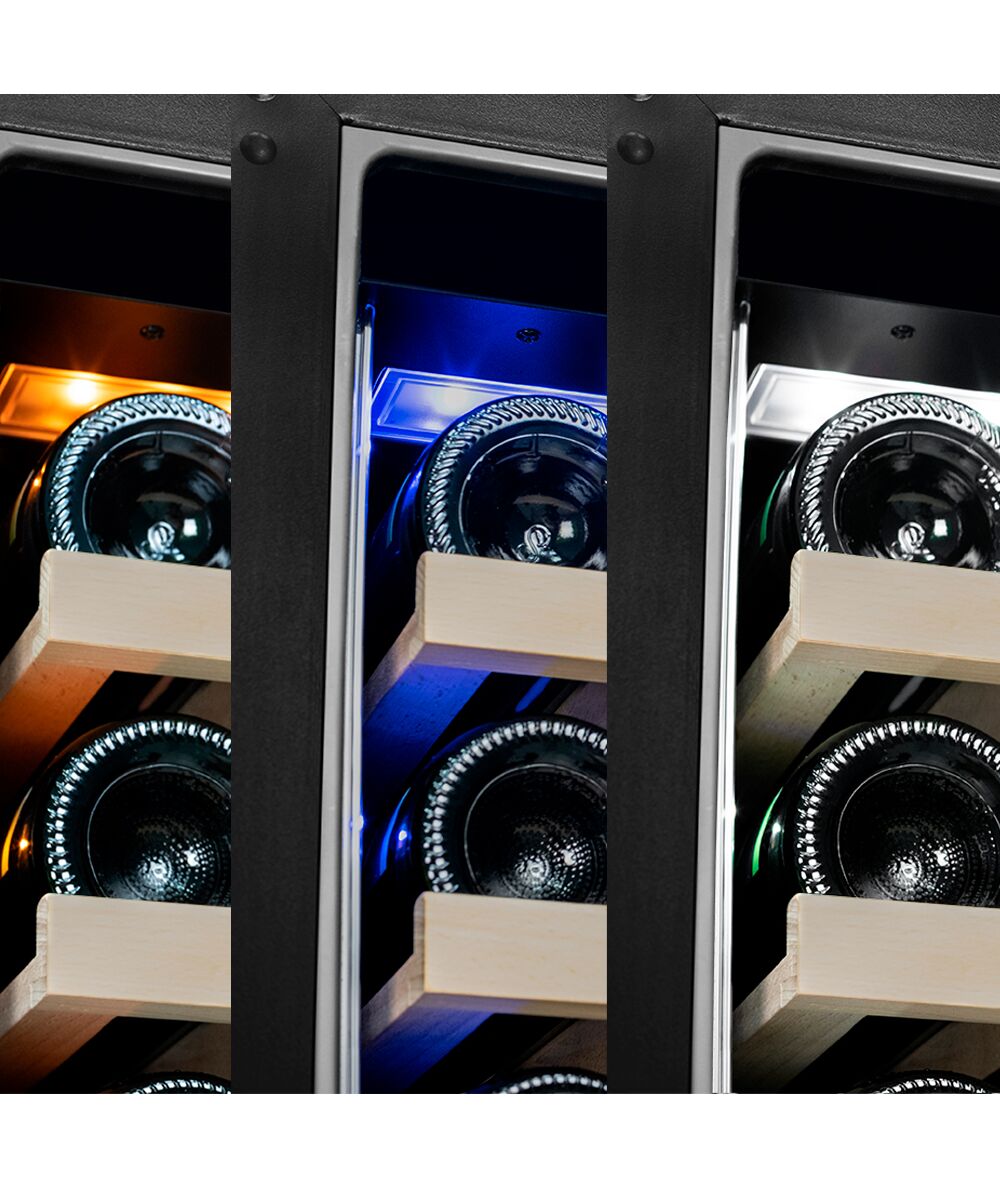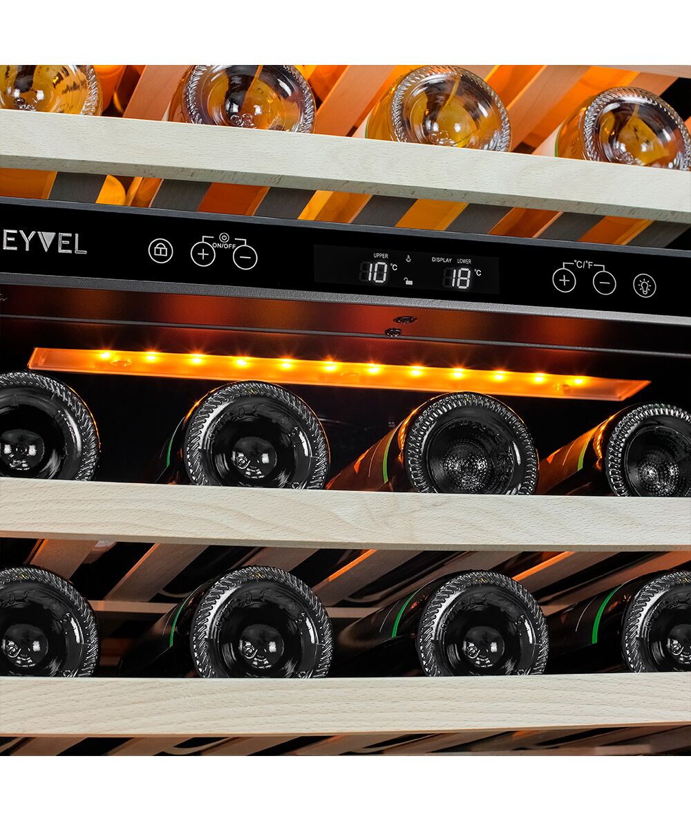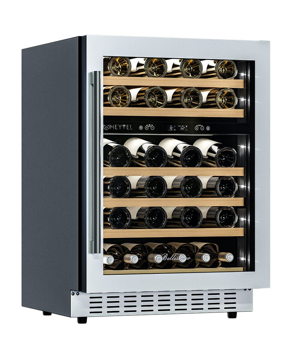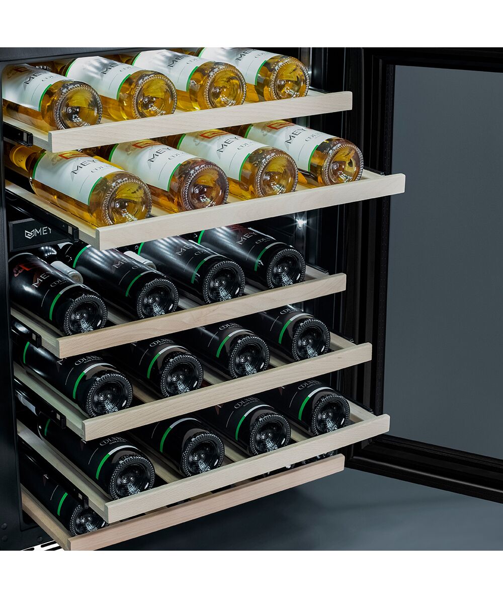 - Компрессорный винный шкаф Meyvel MV46PRO-KWT2 обладает большой вместимостью и даёт возможность разместить до 46 бутылок стандартного типа Бордо (0,75 л). Располагаются они на выкатных полках из дерева. Внутреннее пространство шкафа разделено на 2 температурные зоны, с возможностью настраивать каждую из них. Диапазон верхней зоны варьируется от +5°C до +12°C, а нижней - от +12°C до +20°C.