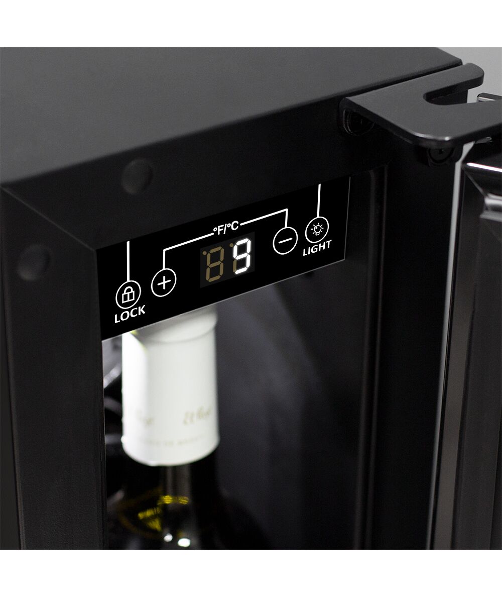 Компрессорный винный шкаф Meyvel MV9-KBT1, несмотря на небольшой размер, обладает большой вместимостью и дает возможность разместить до 9 бутылок. Располагаются они на держателях из массива бука. Внутреннее пространство шкафа поддерживает комфортную для вина температуру от +5.