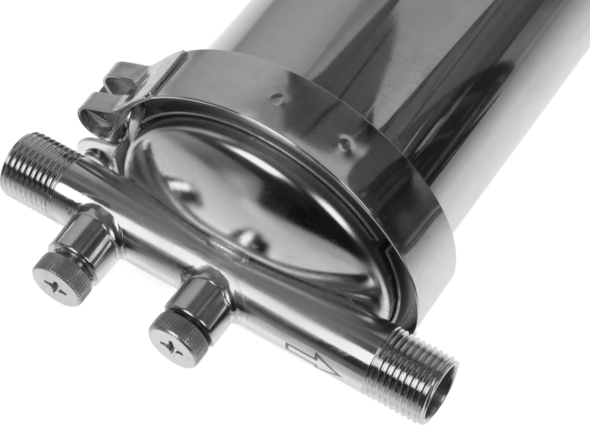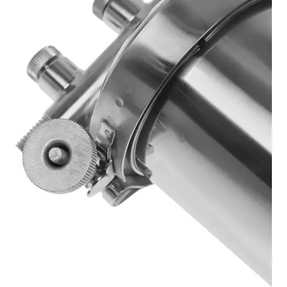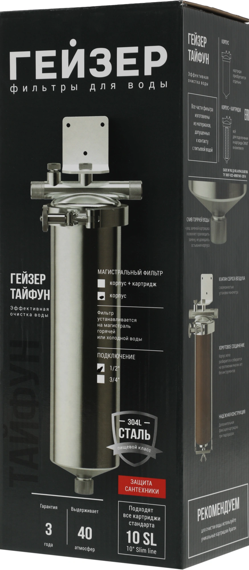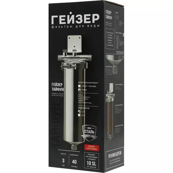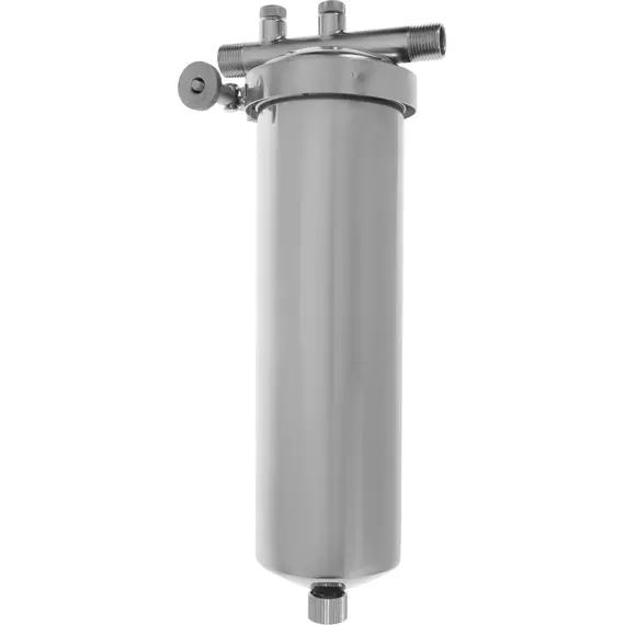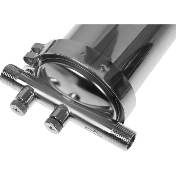 Корпус и крышка фильтра изготовлены из высококачественной нержавеющей стали марки 304L с металлической скобой. Корпус рассчитан на работу под давлением и установку на входе в систему горячего или холодного водоснабжения. Внизу корпуса находится клапан слива воды для удобной замены картриджа.