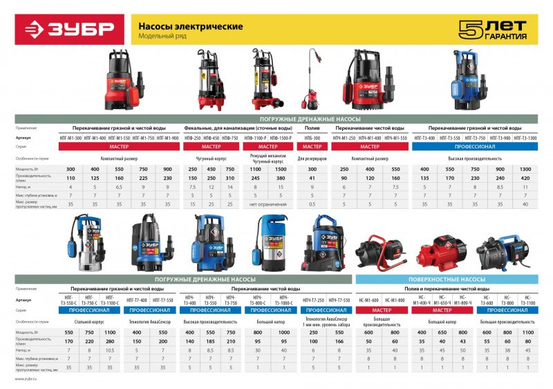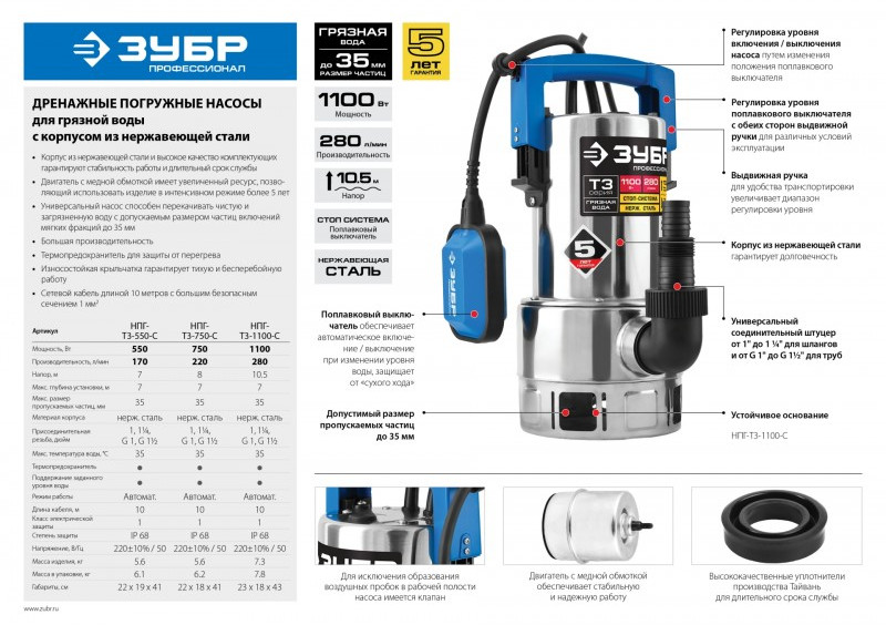 Дренажный насос для грязной воды Зубр Профессионал НПГ-Т3-1100-С 1100 Вт, нерж. сталь