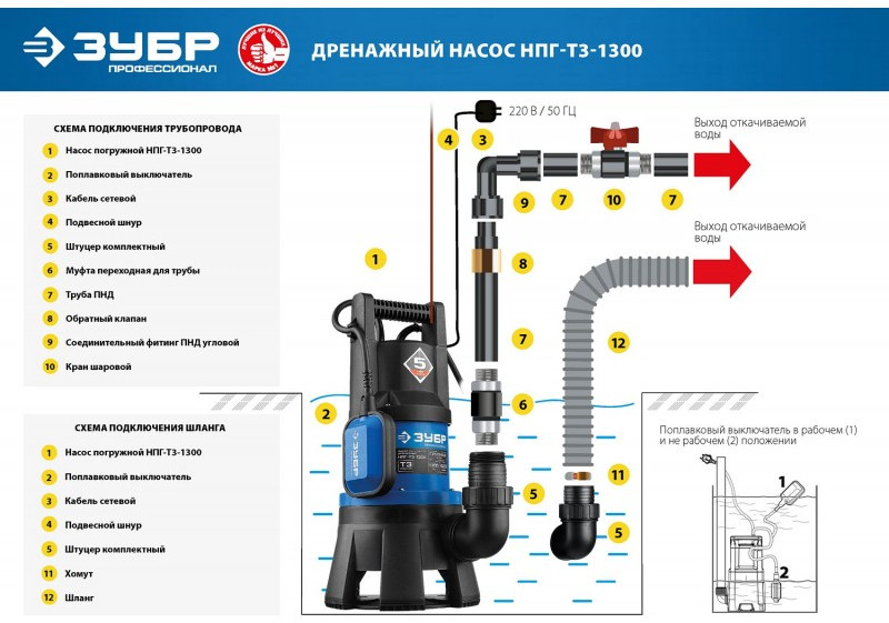 Дренажный насос для грязной воды Зубр Профессионал НПГ-Т3-1300 1300 Вт