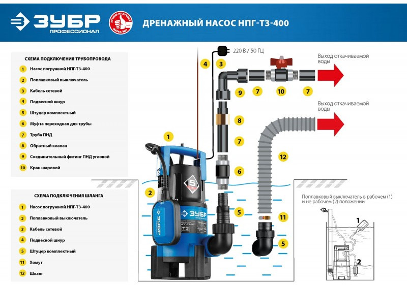 Дренажный насос для грязной воды Зубр Профессионал НПГ-Т3-400 400 Вт