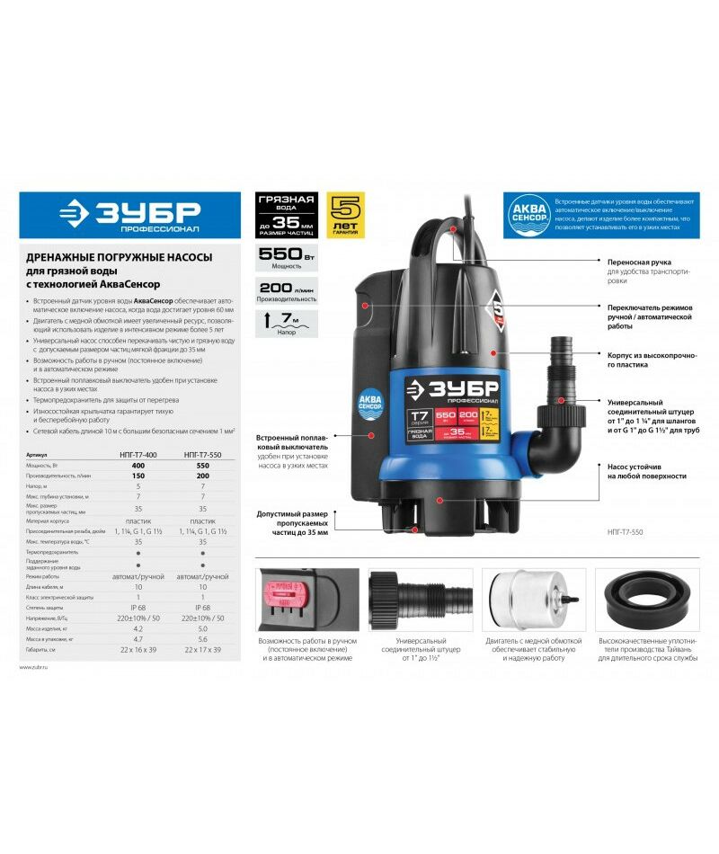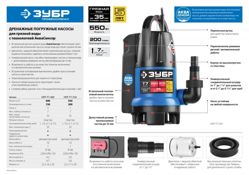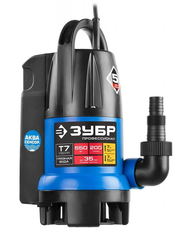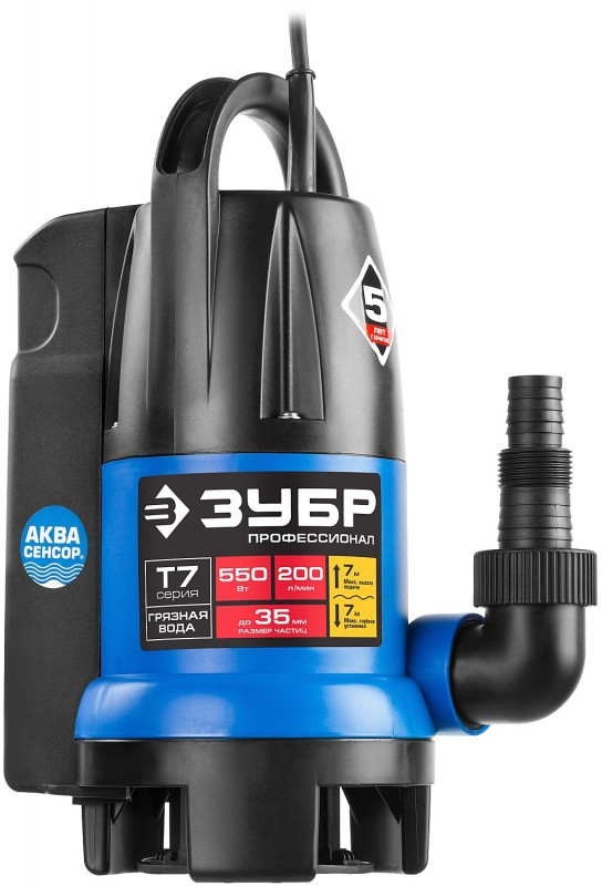 Дренажный насос для грязной воды Зубр Профессионал НПГ-Т7-550 550 Вт, АкваСенсор