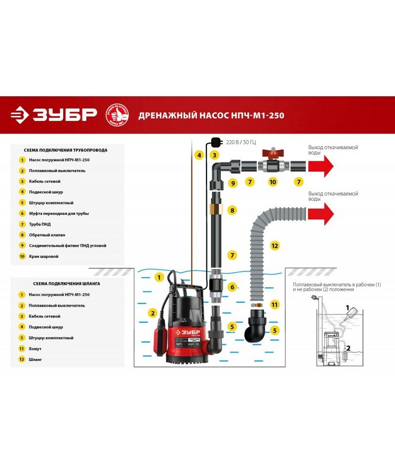 Дренажный насос с минимальным уровнем откачки Зубр НПЧ-М1-250 250 Вт
