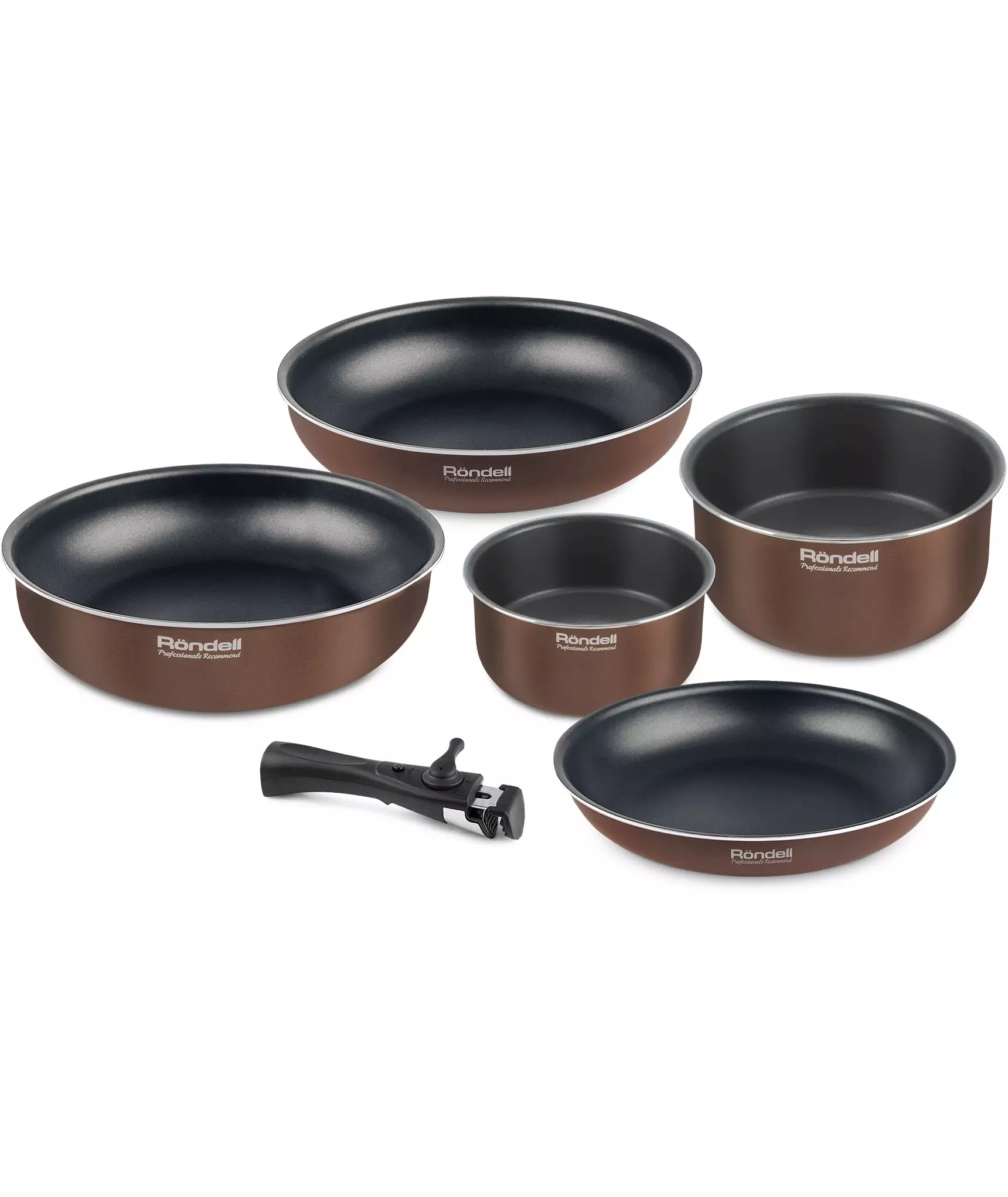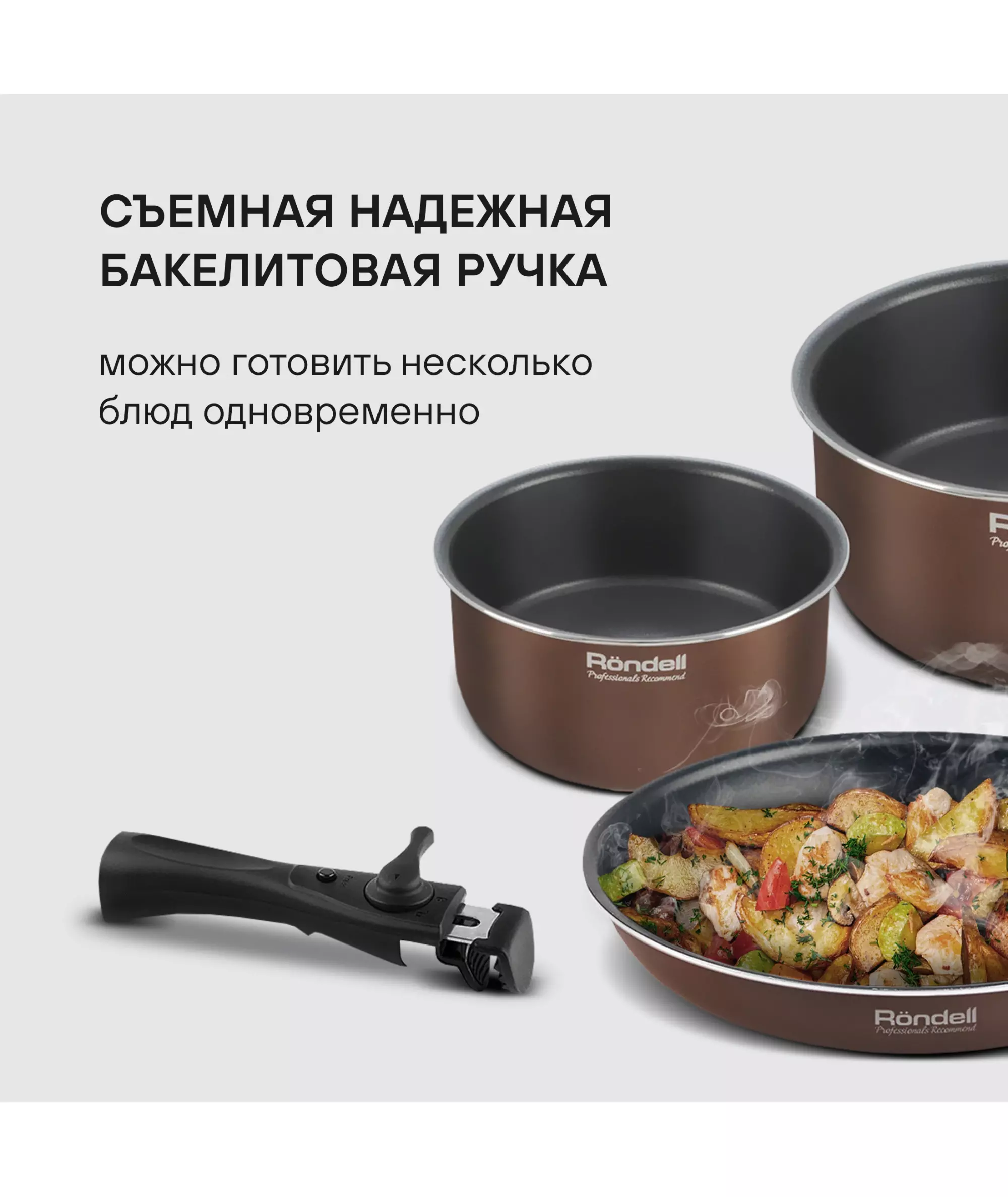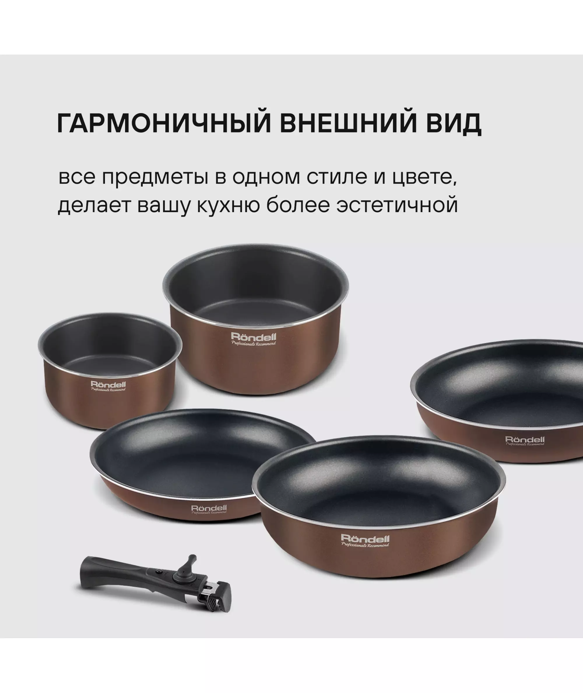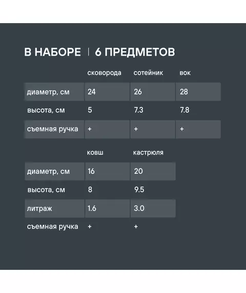 | Состав комплекта | Сковорода 24х5см, сотейник 26х7,3см, вок 28х7,8см, ковш 16х8см, кастрюля 20х9,5см, съемная ручка |