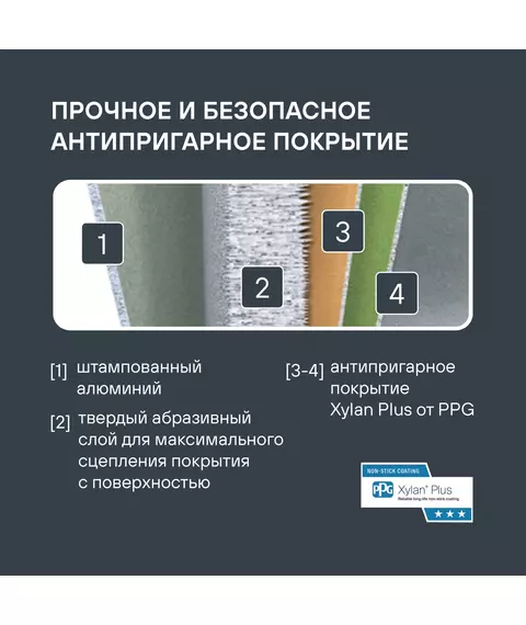| Особенности | Материал: штампованный алюминий. Внутреннее покрытие: Xylan® Plus – двухслойное, долговечное антипригарное покрытие для интенсивного использования. Толщина стенок: 2,5 мм. Толщина дна: 2,5 мм. Аксессуары: съемная надежная бакелитовая ручка. |