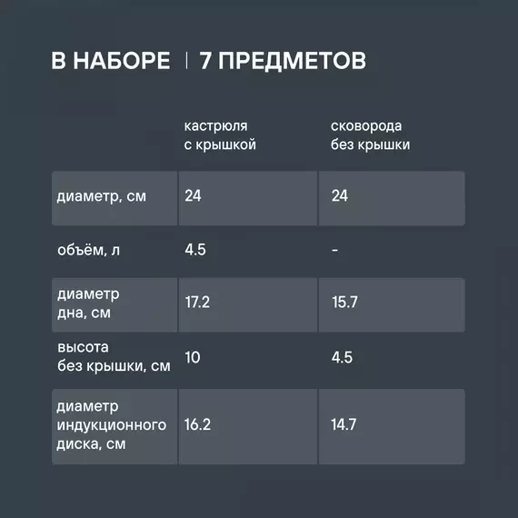 | Состав комплекта | Ковш 16х8см, кастрюли 20х9см, 24х10,5см, c крышками, сковорода 24х4,5 см |