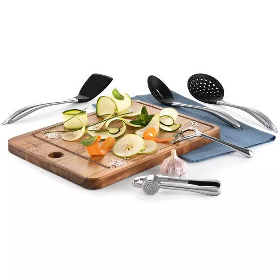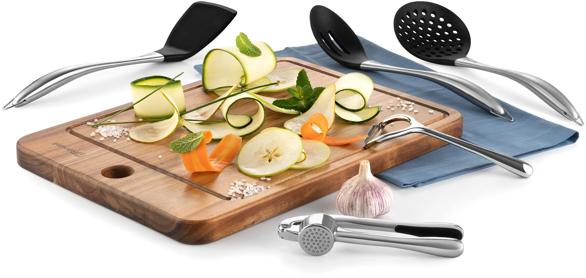 Кухонные гаджеты коллекции Modern (пресс для чеснока, овощечистки, ключ для консервных банок) изготовлены из цинкового сплава с хромированным покрытием, а функциональная часть овощечисток — из нержавеющей стали, что гарантирует им особую долговечность.