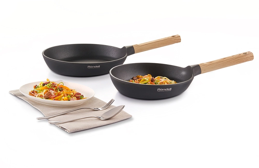 | Особенности | Технология: специальная фактурная обработка внутренней поверхности. Аксессуары: из бакелита, с покрытием Soft Touch. Преимущества: оригинальная форма корпуса для удобства переворачивания блюда. Упаковка: картонный рукав. |