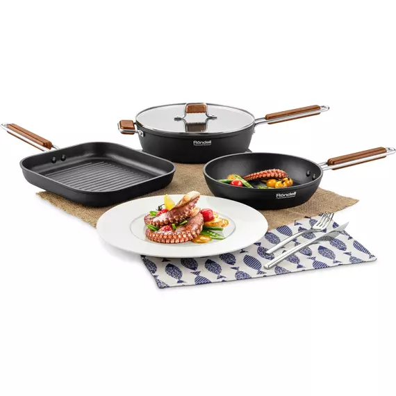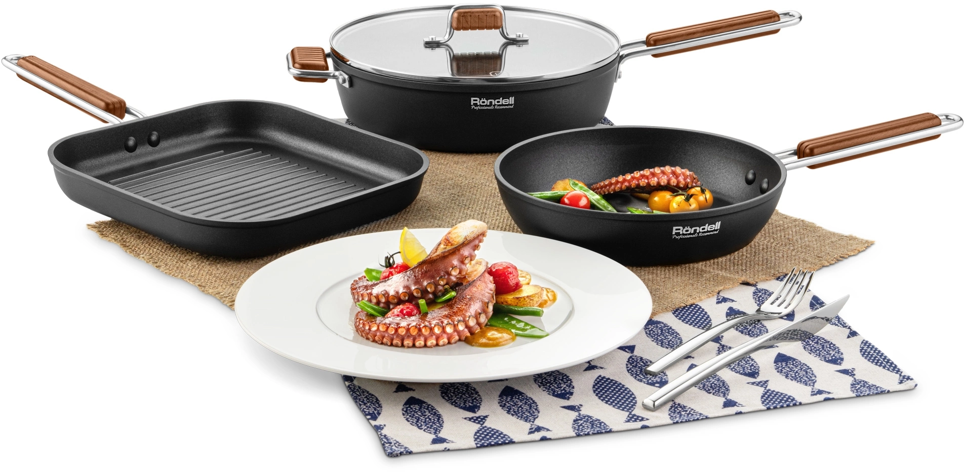 | Особенности | Аксессуары: оригинальная конструкция ручек - комбинация стали и бакелита, стилизованных под дерево. Преимущества: удобный хват. Xylan® Plus – двухслойное, долговечное антипригарное покрытие для интенсивного использования. Специальное внешнее термостойкое покрытие для легкого ухода. |
