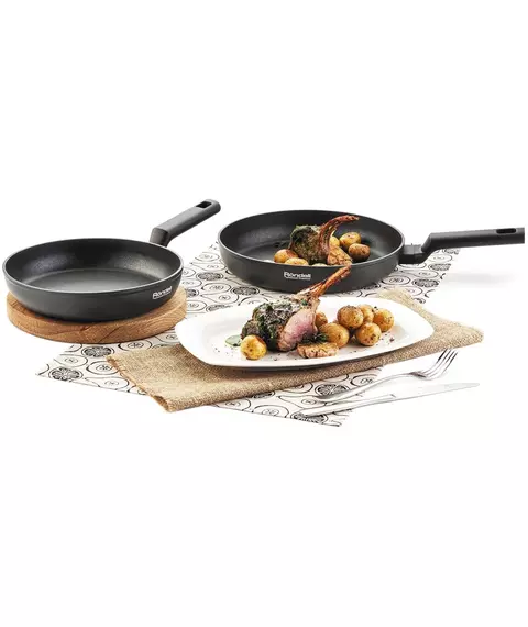 | Особенности | Ручки из бакелита с покрытием Soft Touch. Преимущества: Цельный индукционный диск – уникальная технология обеспечивает быстрый и равномерный нагрев посуды, долговечность использования и предотвращает окисление алюминия в ПММ. Наличие сливов позволяет контролировать объем жидкости во время тушения. |