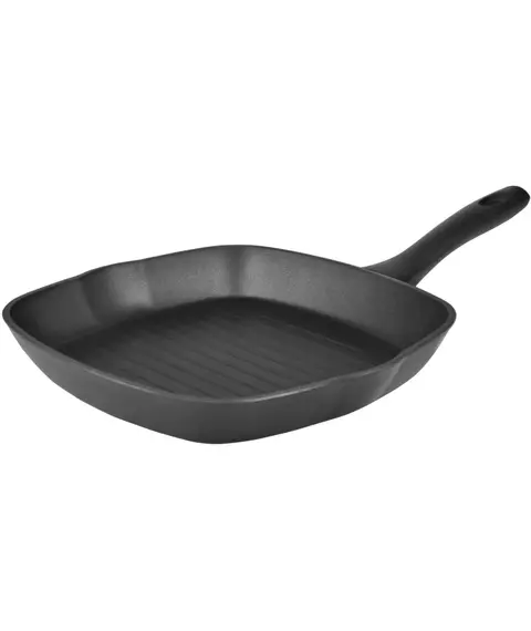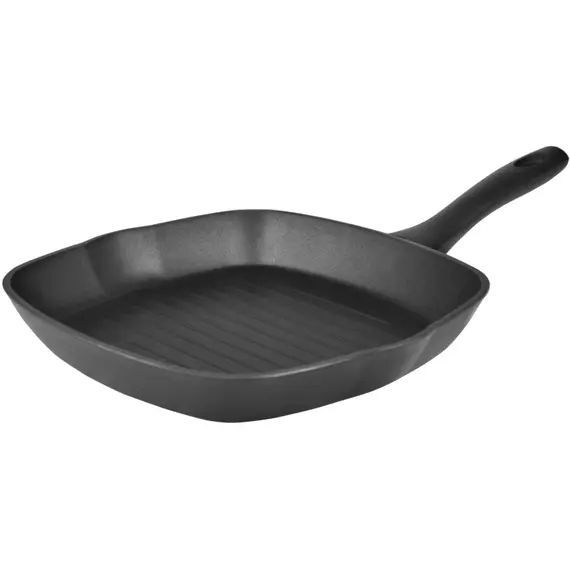 | Особенности | Аксессуары: прочная бакелитовая ручка. Преимущества: ребристое дно для "гриль"-эффекта при жарке; Равномерный прогрев изделия; Равномерная толщина стенок и дна посуды; Классическая форма. Упаковка: картонный рукав. |