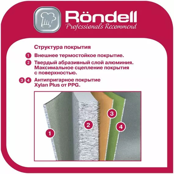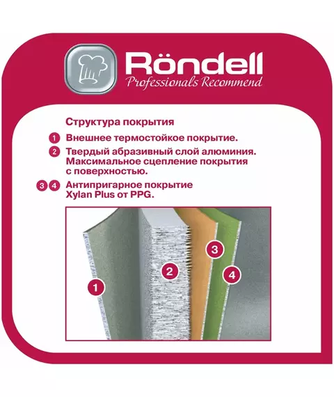 | Особенности | Аксессуары: эргономичные из бакелита с силиконовым напылением. Преимущества: специальное внешнее термостойкое покрытие для легкого ухода; Xylan® Plus – двухслойное, долговечное антипригарное покрытие для интенсивного использования. Упаковка: картонный рукав. |