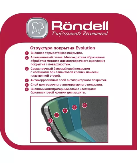 Сковороды коллекции Evolution-R обладают уникальной функциональностью благодаря передовой технологии обработки внутреннего дна газо-плазменным напылением с использованием слоев покрытия алмазной крошки. Это позволяет усилить антипригарные свойства посуды, надежность и длительность жизни покрытия.
