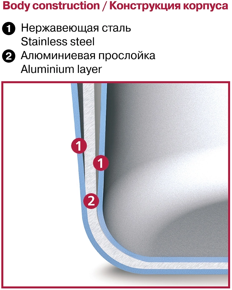 | Особенности | Технология: TRIPLY - монолитный корпус, трехслойная структура дна и стенок. Преимущества: равномерное распределение температуры в процессе приготовления блюд. «Эффект русской печи» (эффект томления). Верхний край ковша (верхний рим) закрытый, поэтому смело можно мыть в ПММ. |