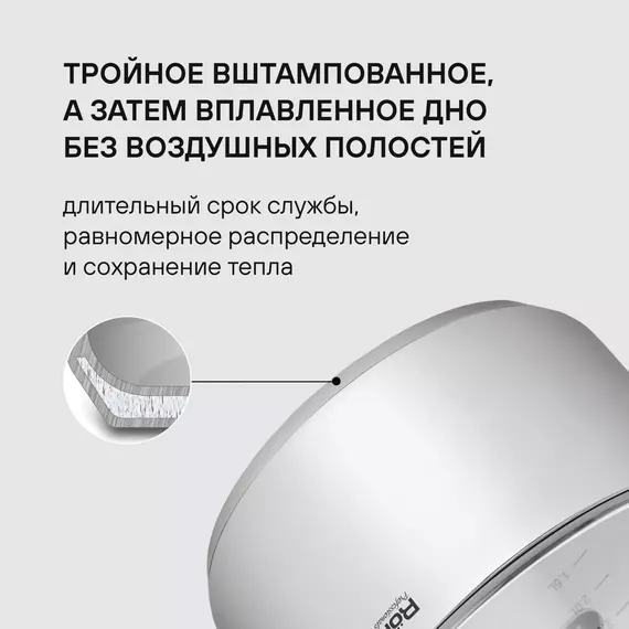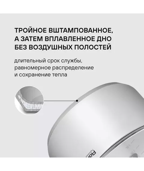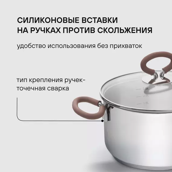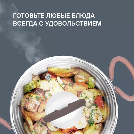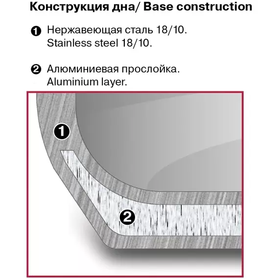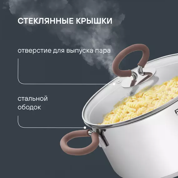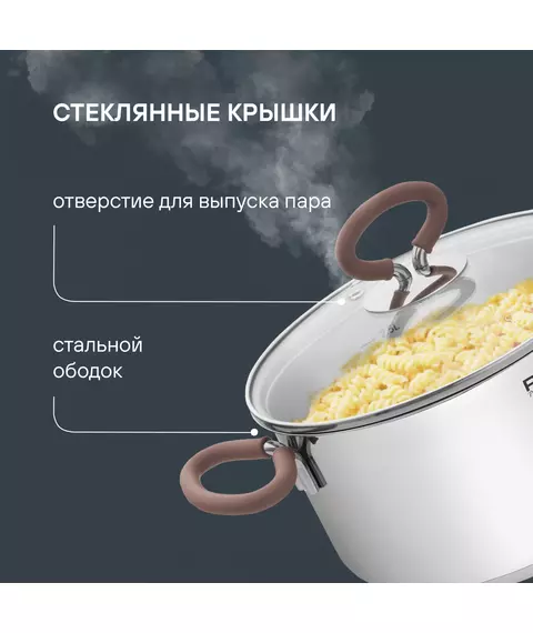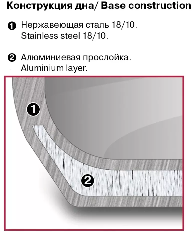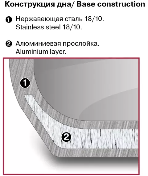 | Особенности | Технология: тройное вштампованное, а затем вплавленное дно без воздушных полостей. Материал крышки: термостойкое стекло. Аксессуары: удобные комбинированные: нержавеющая сталь и силикон. Преимущества: эргономичная форма ручек; Удобный хват; Силиконовые вставки на ручках против скольжения. |