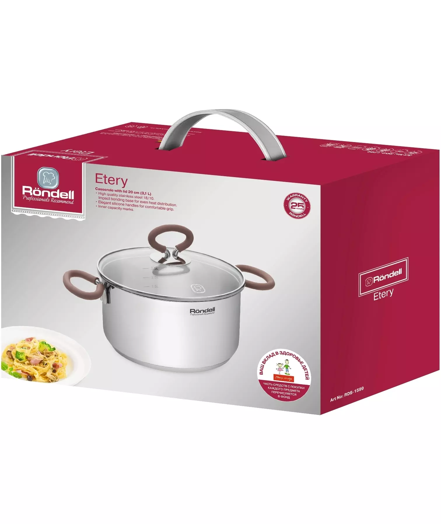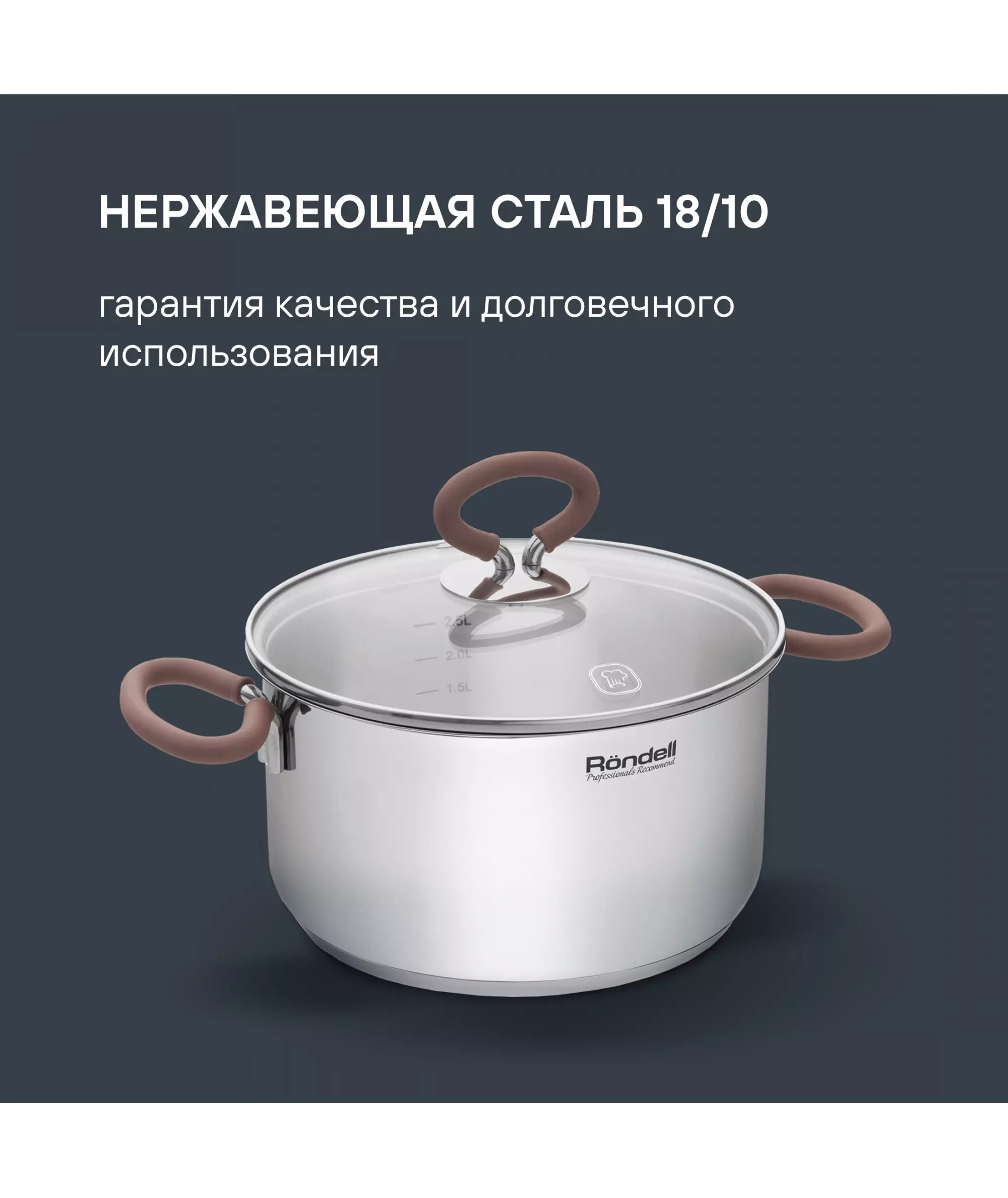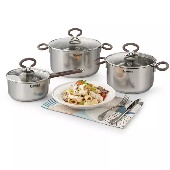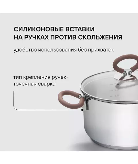 | Особенности | Технология: тройное вштампованное, а затем вплавленное дно без воздушных полостей. Материал крышки: термостойкое стекло. Аксессуары: удобные комбинированные: нержавеющая сталь и силикон. Преимущества: эргономичная форма ручек; Удобный хват; Силиконовые вставки на ручках против скольжения. |