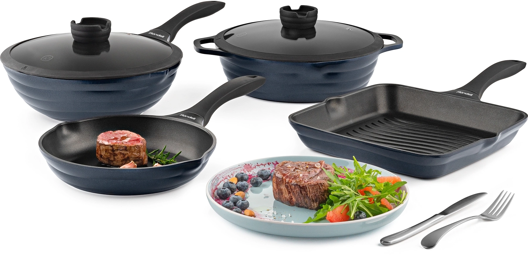 Коллекция Royal Blue: изготовлена из литого алюминия, известного своей высокой теплопроводностью. Благодаря этому свойству посуда Royal Blue особенно рекомендуется для длительного томления блюд. Внимания заслуживает также внутреннее трехслойное антипригарное покрытие Eclipse HB.