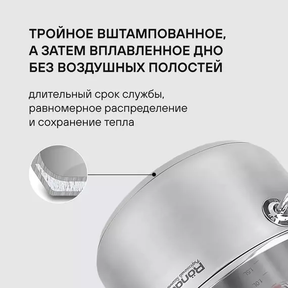| Особенности | Материал: высококачественная нержавеющая сталь 18/10. Технология: тройное вштампованное, а затем вплавленное дно без воздушных полостей. Материал крышки: термостойкое стекло. Аксессуары: удобные комбинированные: нержавеющая сталь и силикон. Преимущества: эргономичная форма ручек. |