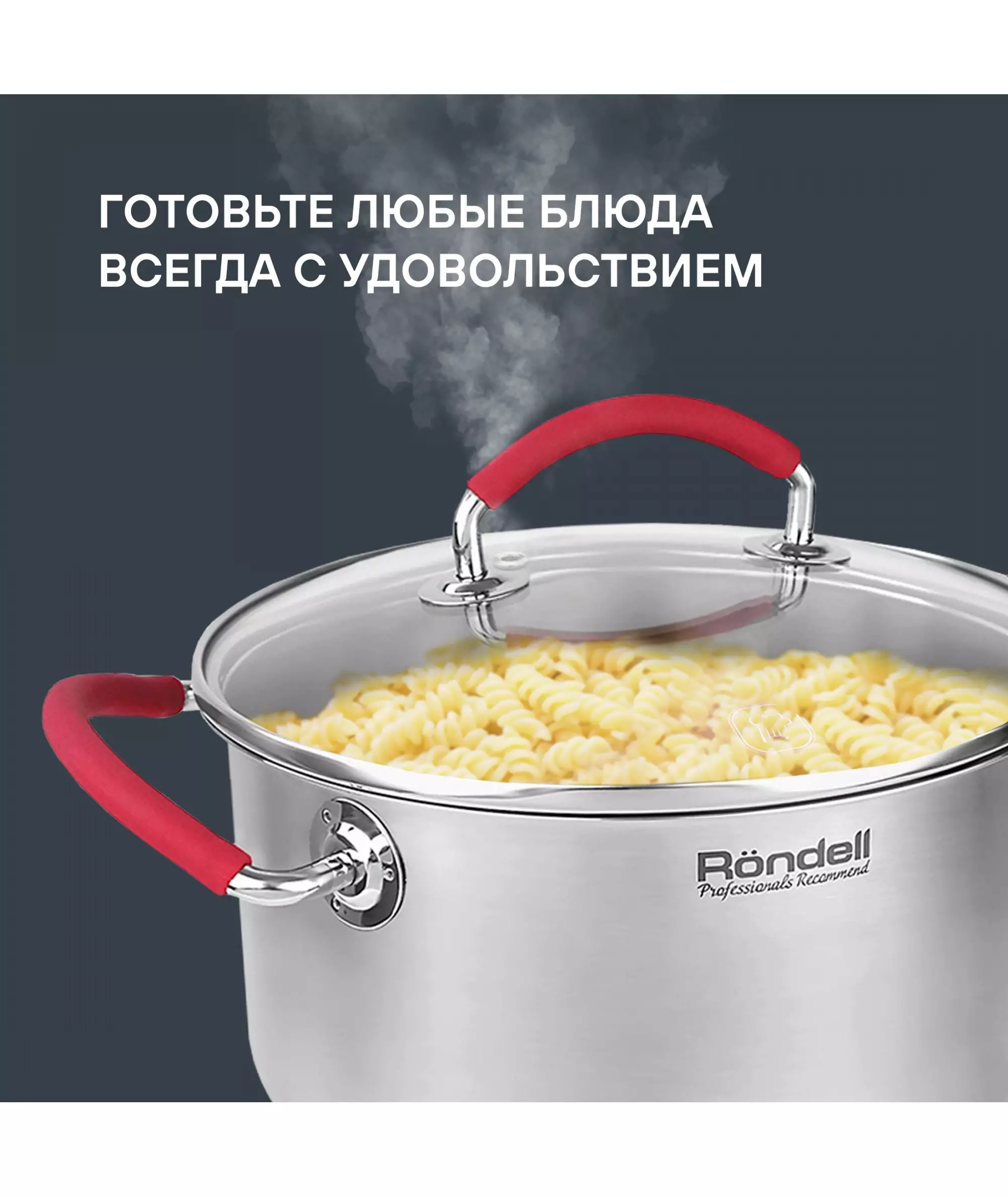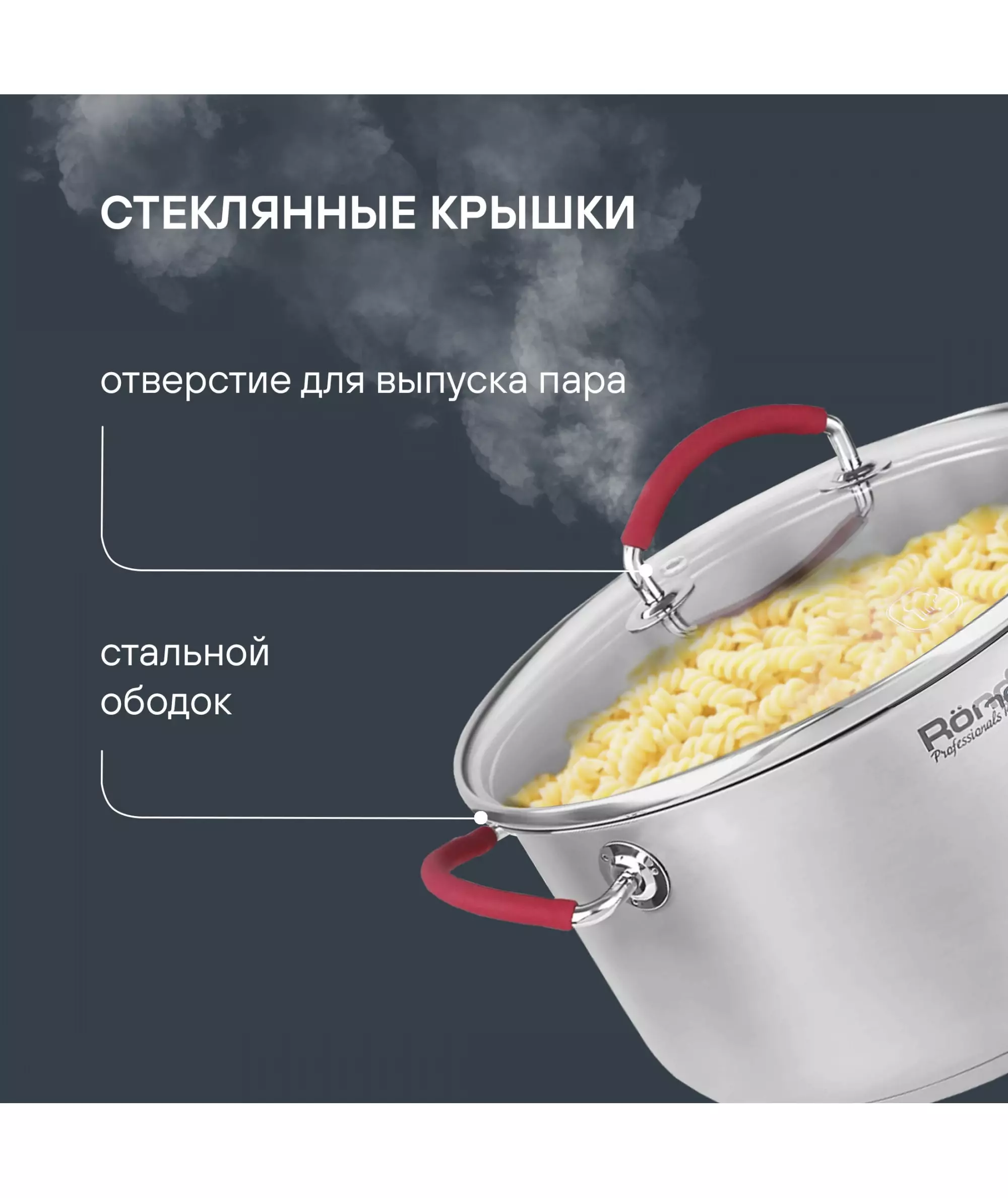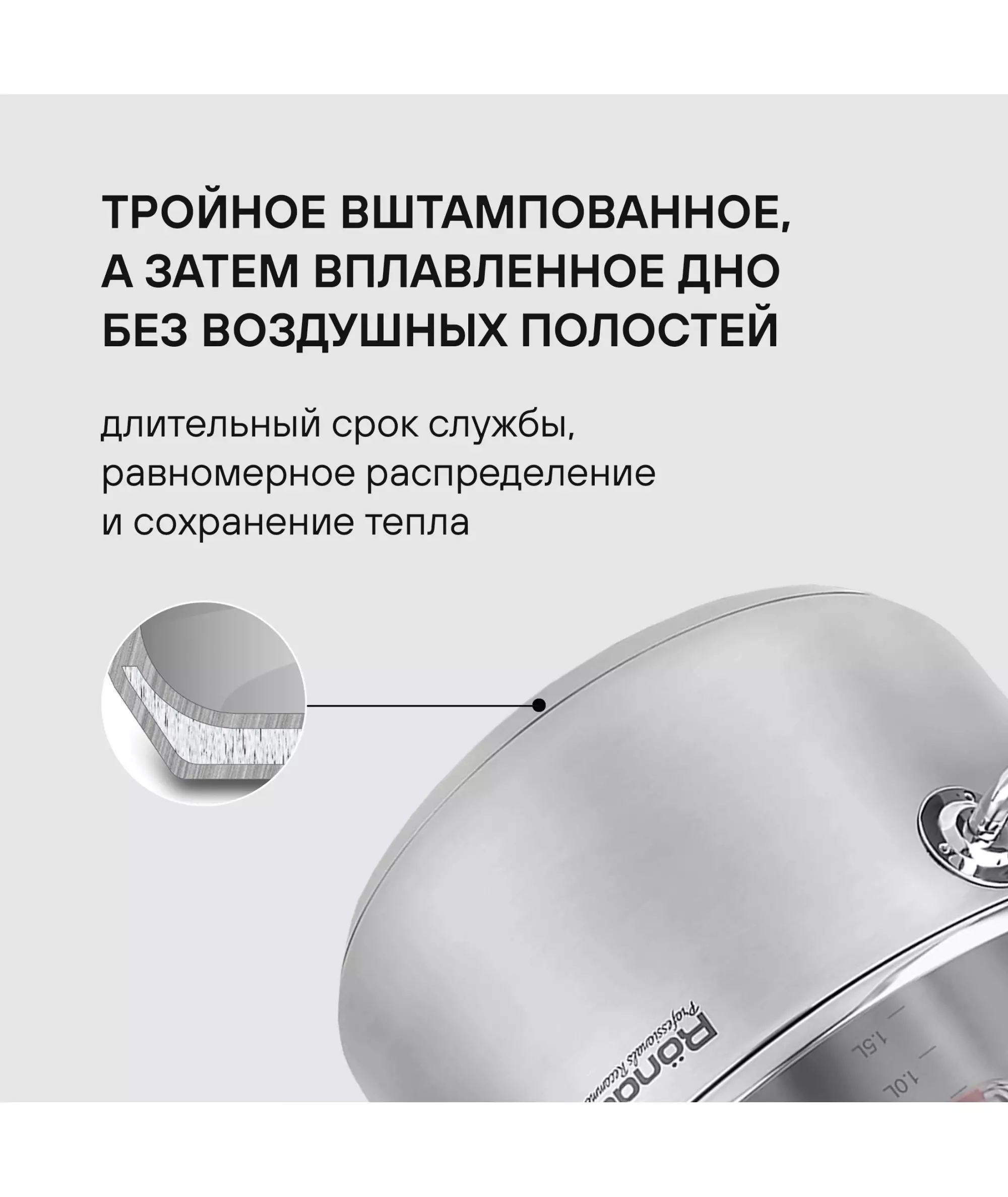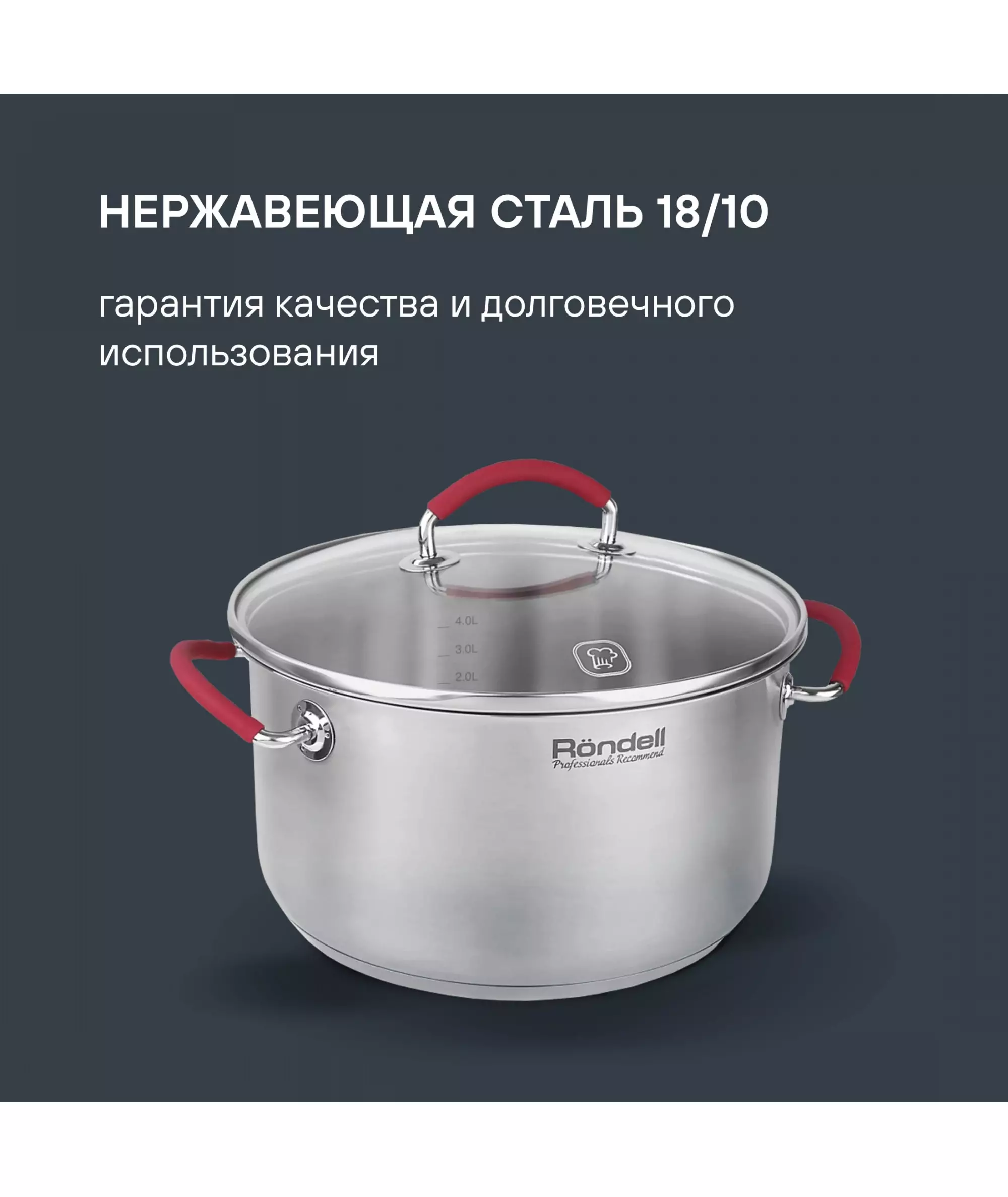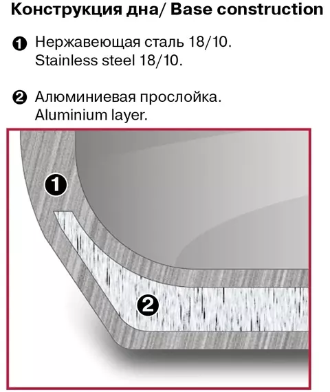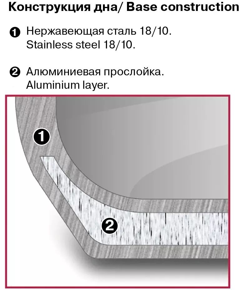 | Особенности | Материал: высококачественная нержавеющая сталь 18/10. Технология: тройное вштампованное, а затем вплавленное дно без воздушных полостей. Материал крышки: термостойкое стекло. Аксессуары: удобные комбинированные: нержавеющая сталь и силикон. Преимущества: эргономичная форма ручек. |