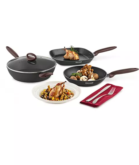 Если вы ищите посуду, способную идеально смотреться на любой кухне, обратите внимание на коллекцию Tierno. Строгий благородный дизайн сковород, сотейника выполненных из надежного кованого алюминия. Особому комфорту в использовании посуды Tierno способствуют бакелитовые ручки с покрытием Soft Touch.