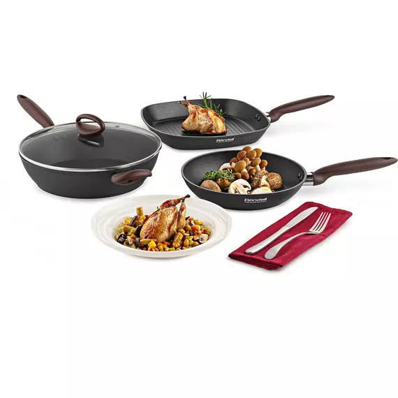 Внутреннее двухслойное покрытие Xylan® Plus, абсолютно безопасное, обладает превосходными антипригарными свойствами. Особому комфорту в использовании посуды Tierno способствуют бакелитовые ручки с покрытием soft touch: они не нагреваются в процессе приготовления, не требуют прихваток.